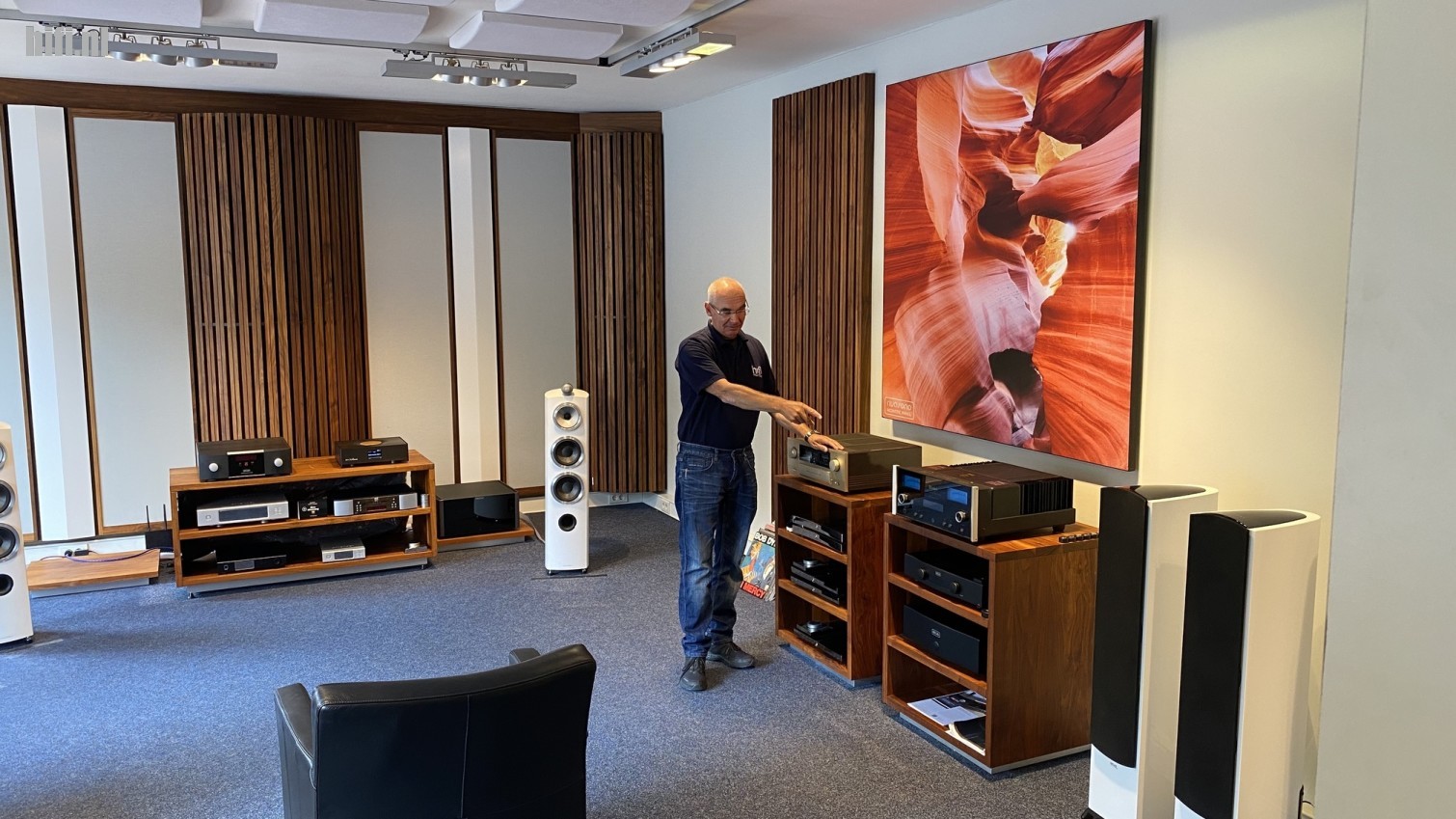 We krijgen een kop koffie en in de eerste luisterruimte wordt een set klaargezet. Ondertussen lopen we even rond in de winkel. Aan een kant staan de planken vol met oude apparatuur, audio en video. De jaartallen staan erbij vermeld. Een korte blik naar brengt ons direct terug in het heden. Prachtige personal audio, streamers, speakers en versterkers. Vooral de personal audio valt op. Het jargon hiervoor is Head-Fi. Ondertussen staat de set klaar en nemen we plaats in de eerste luisterruimte. Aan de rechterkant kijken we uit op de straat. Het is een beetje een regenachtige dag. Perfect om binnen te genieten van muziek. We hebben zelf overigens niets meegenomen, maar daar hebben ze bij Hifi Solutions aan gedacht: er is een ruime keuze aan uiteenlopende muziek. Een rek aan de muur brengt ons terug naar de dagen dat we bij de Free Record naar cd’s stonden te luisteren. Een keuze maken was toen al moeilijk genoeg, laat staan nu.