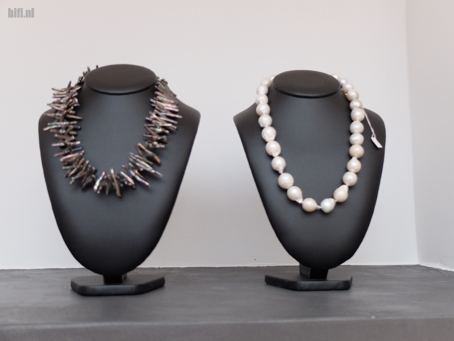 Bij Authentic vind je ook sieraden met parels. “Meer bepaald zoetwaterparels”, legt Mary-Ann uit. “Gewone parels hebben een nogal ouderwetse uitstraling. Zoetwaterparels zijn veel ongelijker en grilliger ruwer. Ze zijn niet alleen beter geprijsd, ik vind ze ook mooier.” Mary Ann-knoopt de parels tot prachtige sieraden waarmee ze de winkel decoreert. Maar alles in de winkel is te koop, ook de decoratie.