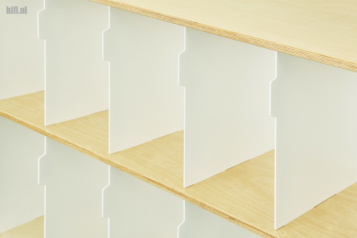 Het eerste wat opvalt aan deze ‘demokast’ – eentje goed gevuld met lege platenhoezen waarbij we ook een paar dubbele exemplaren spotten – is het gegeven dat modulair bij For The Record geen compromis voor design is gebleken. Nu hadden we dat ook nergens verwacht, bij het team dat er ook in de andere ondernemingen naar streeft om een bron van inspiratie te zijn door rondom vinyl een hele levensstijl te creëren. For The Record mag namelijk een nieuwe (merk)naam zijn, moederbedrijf Swordfish & Friend draait al wat langer rond in platenland. “Vanuit die ervaring weten we als geen ander dat er bij veel liefhebbers behoefte is aan een vinylkast die met de collectie meegroeit”, legt Parlevliet uit. Als de kast te klein wordt omdat je je niet in kon houden bij een braderie, tijdens Record Store Day of op een zaterdagmiddag in de platenzaak en de verzameling weer eens is gegroeid, kan er simpelweg een nieuwe losse laag worden bijgeplaatst. "Het geheel is bovendien zeer toekomstbestendig."