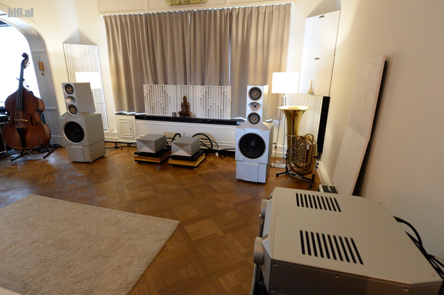 Met importeur Frank Vermeylen is het altijd goed toeven. Niet alleen vertegenwoordigt hij een aantal absolute topmerken, maar Frank is ook uitvoerend musicus. De meeste musici hebben een stel zeer goede oren en je hoeft ze niet te vertellen hoe live-muziek en instrumenten klinken en wat een hifi-systeem zou moeten doen om daar in de buurt te komen. Ook houdt Very Fine Solutions zich bezig met akoestische ontwerpen. Er is zeer geavanceerde meetapparatuur voor aanwezig en tijdens het bezoek werd de interactie van het opgebouwde audiosysteem met de luisterruimte gevisualiseerd in grafieken. Het aankopen van kostbare audio-apparatuur zonder te investeren in de akoestiek is een absolute no-go. De standaard-reactie van audiofielen is altijd dat als het niet klinkt er oeverloos gerommeld gaat worden met kabels en andere accessoires. Totaal zinloos. Er bestaat geen enkel audiosysteem dat goed presteert in problematische akoestische omstandigheden. Een bouwkundige aanpassing van de akoestiek en/of de toepassing van slimme akoestische materialen heeft een invloed van pakweg 80 procent op het geluidsmatige resultaat.