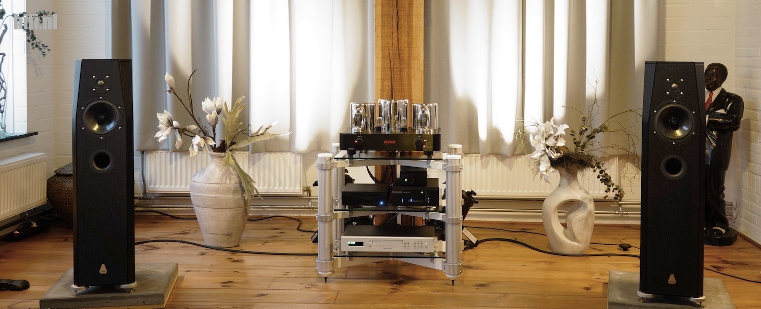 Alsof we elkaar vorige week nog zagen, terwijl in werkelijkheid een periode van ongeveer 25 jaar tussen onze eerste en enige ontmoeting tot vandaag heeft gezeten, raken we aan de praat over de vele geneugten van muziek, en over oude tijden waarin anekdotes zijn ontstaan en vriendschappen werden gesloten. Verbindende factor zoals zo vaak is de passie voor muziek en de weergave van muziek. In zijn demoruimte aan de Tramstraat in Schoonoord staat het systeem opgesteld waar vandaag naar geluisterd gaat worden. Opgesteld in een ruimte opgebouwd met veel hout, lichte gordijnen, een kleed op de vloer, gemakkelijke stoelen, kortom een ruimte die niet overdadig akoestisch is aangepast maar overeenkomt met veel huiskamers in Nederland. Uitgezonderd het hoge plafond omdat het dak in een punt toeloopt en je vanuit de stoel tot in de nok kunt kijken. Deze Westerling voelt zich er al bijna thuis vanwege het soms voortrazende verkeer op de doorgaande weg, de drukte van de Randstad lijk ik te hebben meegebracht. Nou ja, druk? Je moet er wel je fantasie bij gebruiken.