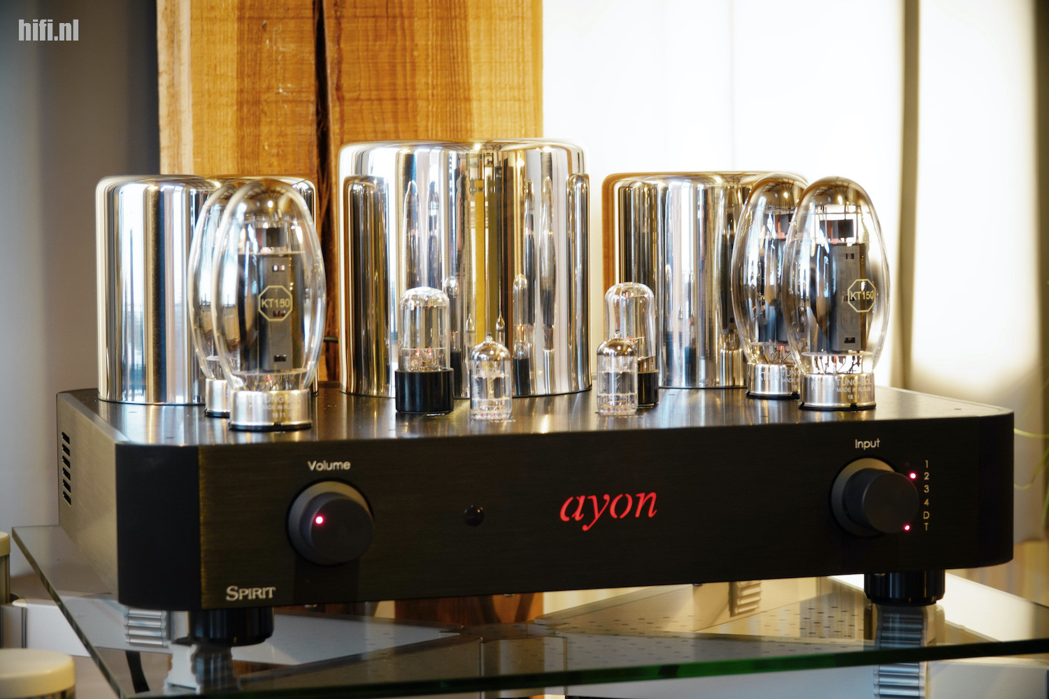 De Ayon Spirit V is een gebalanceerde buizenversterker met als eindbuis een paartje KT150 per kanaal. De Spirit is zowel in triode als in penthode te schakelen. Een soft start bias regeling voor de buizen geschiedt automatisch voor elke luistersessie en na langer gebruik is de hele versterker automatisch te resetten voor een lange levensduur van de buizen. De gebruiker hoeft nooit te frummelen met universeelmeter en een schroevendraaier. De Ayon kent nogal wat speciale features zoals een protectie circuit voor de buizen, 0 dB feedback, ultra korte signaalwegen, hard-wiring en het vermijden van halfgeleiders in de signaalweg.