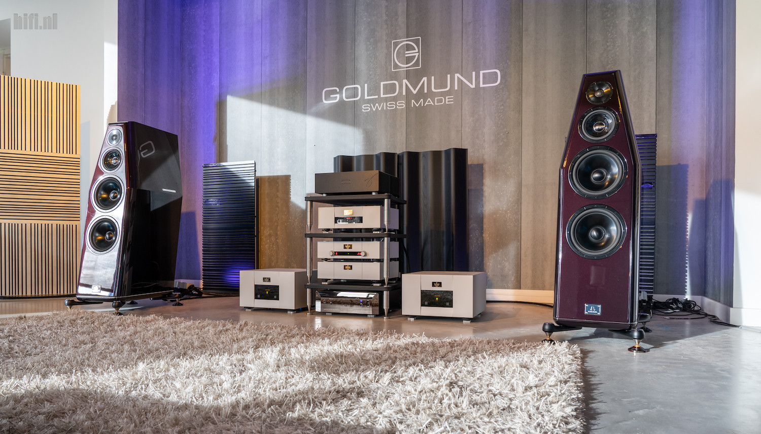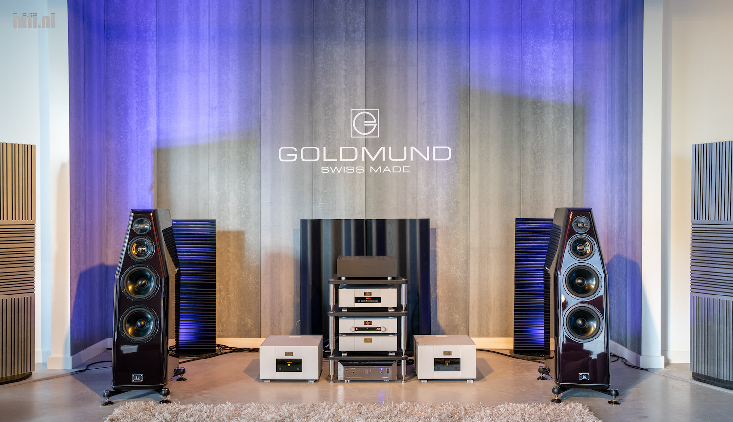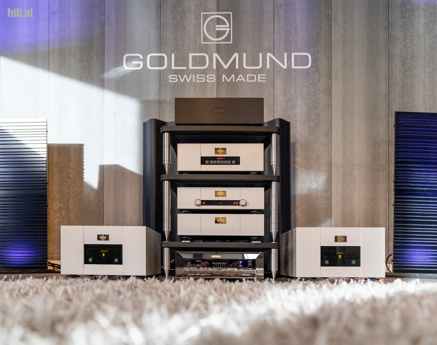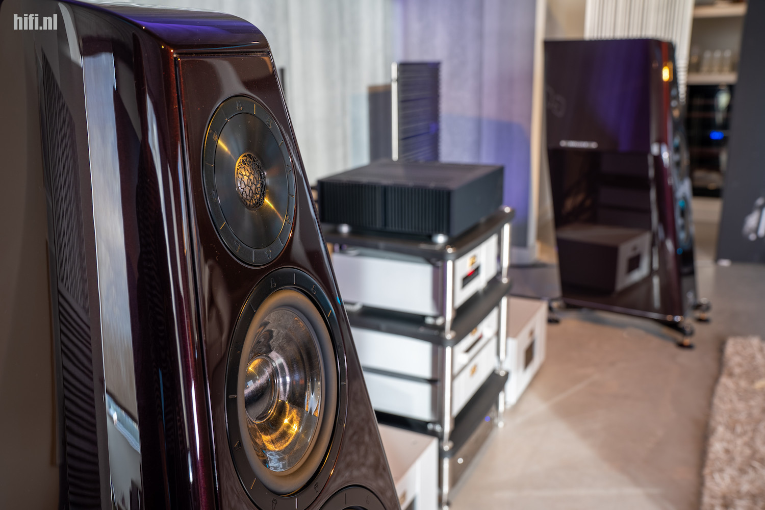 Nog meer XLR Ikigai Kangai interlinks gaan naar de links en rechts opgestelde Goldmund Telos 1000 NextGen mono eindversterkers. Goldmund heeft gelijk met hun stelling dat des te krachtiger de eindversterker is, des te beter zal de controle zijn over de luidspreker. Waarbij power niet de enige belangrijke parameter is, maar natuurlijk meer zaken zoals stabiliteit van de voeding, een groot frequentiebereik, lage vervorming en lage eigen ruis. Het door Goldmund ontwikkelde Leonardo onderzoeksprogramma vormt de basis voor elk Goldmund onderdeel, de DAC, de voorversterker en de Telos 1000 mono eindversterkers. De Telos 1000 maakt intern gebruik van een fysiek gescheiden stuur- en eindversterker om negatieve beïnvloeding van de circuits onderling te voorkomen. De zeer lage uitgangsimpedantie van de eindtrap houdt de woofers in elke luidspreker volledig onder controle tot aan de laagste frequenties. Geen vervormde en/of ongedefinieerde bas, wel behoud van de kleinste details. Elk Telos 1000 blok levert een vermogen van 365 Watt aan 8 Ohm. Om aan te geven hoe ruim de voeding is bemeten van elke Telos 1000, het gewicht per mono eindversterker is 60 kilo! Met het passeren van de Goldmund onderdelen verklap ik vast de prijzen, de Mimesis 20H NextGen DAC heeft een prijs van 85.000 euro, de Mimesis 37S NextGen voorversterker kost 30.000 euro en de Telos 1000 eindtrap is 68.500 euro per stuk.