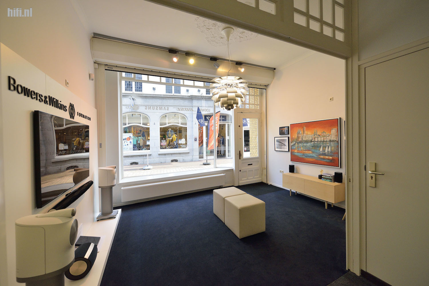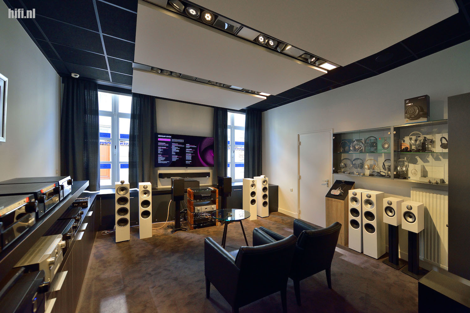 Terwijl we na de verkwikkende lunch op weg gaan naar de speciale Dolby Surrond Studio in één van de geschakelde winkelpanden, bezoeken we zijdelings ook nog even een zijvleugel waar helemaal aan het einde van de gang het complete assortiment aan Bowers & Wilkins Formation producten staat opgesteld.