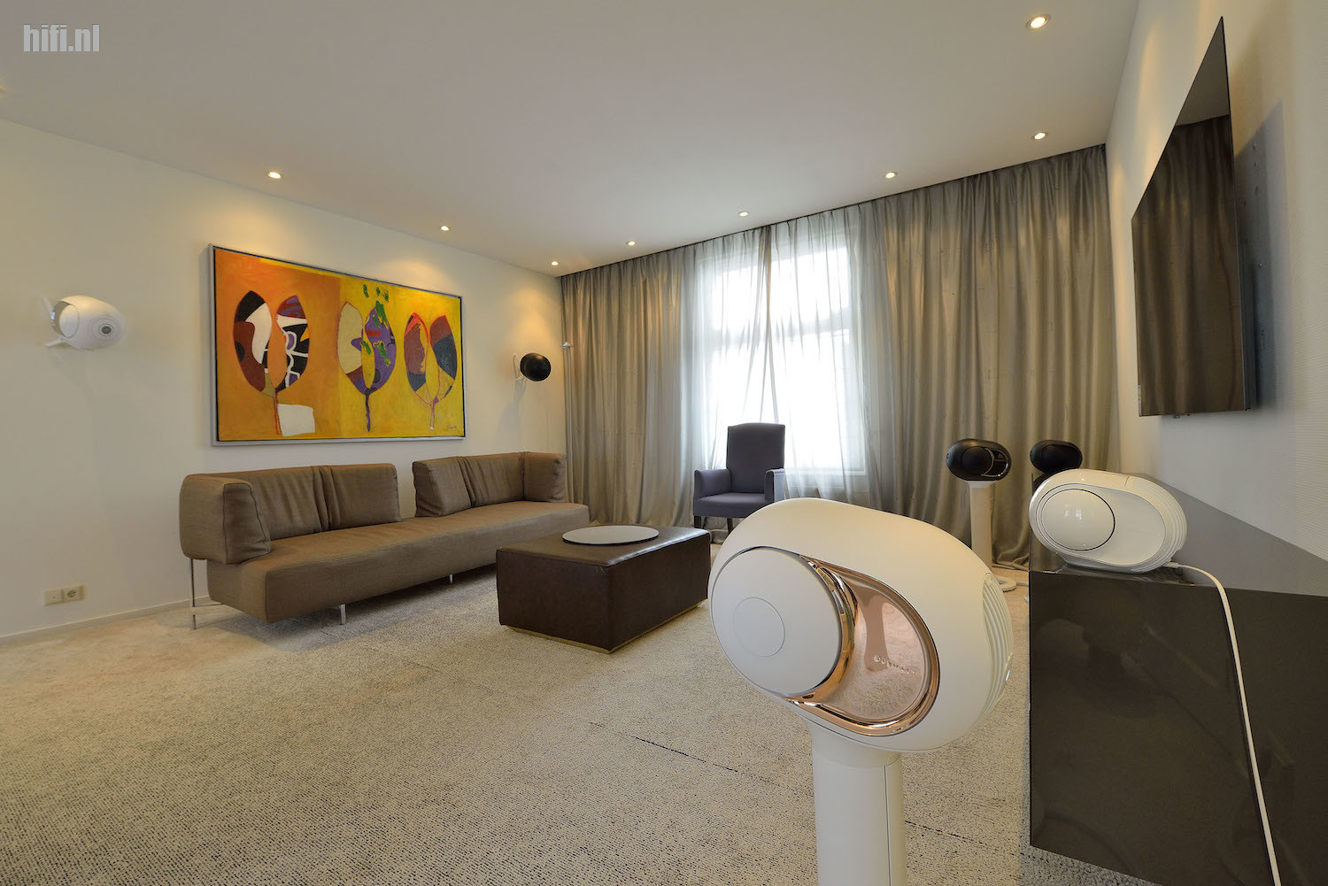 Een naam die de laatste tien jaar bijna net zo iconisch is geworden als Luxaflex voor zonwering en Tipp-Ex als correctievloeistof, is ongetwijfeld Devialet met zijn Phantom op het gebied van draadloze luidsprekers. Met zijn kenmerkende bolle vormgeving, het bijzonder gestileerde akoestische rooster voor de tweeter en natuurlijk de bij basrijke muziek wild meebewegende woofers aan beide zijkanten, is de inmiddels uit meerdere modellen bestaande serie niet meer weg te denken uit veel leefomgevingen. Poulissen voert zowel de complete lijn Phantom luidsprekers als de legendarische Pro serie versterkers en in deze veel grotere ruimte van woonkamerafmetingen staan alle Phantom modellen speelklaar opgesteld.