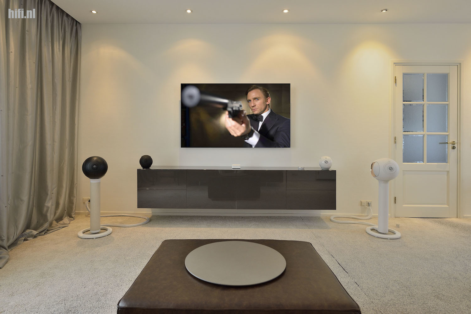 Het is één van de ruimtes die onlangs een complete metamorfose heeft ondergaan en waar kosten nog moeite zijn gespaard om de klant een beleving te geven die binnen het prijssegment (hopelijk) ongekend is. We gaan van start met een Denon AVR-X2700H AV receiver (€ 729,-) die geluid tot 7.2 kanalen kan verwerken en beeld in zelfs 8K. Beeldscherm van dienst is een prachtige OLED LG CX, terwijl de luidsprekers in dit voorbeeld een 5.1 opstelling uit de Bowers & Wilkins M1 reeks is. Gecompleteerd met de opvallend bolvormige PV1D sub (totaal € 2.499,- voor deze MT60D set) is er niets aan de hand zou je zeggen. Maar eigenlijk geneer ik me toch een beetje. Want van Poulissen ben ik inmiddels best het nodige gewend en dan lijken zulke kleine bijna onzichtbare kleine speakers op een design statief gevoelsmatig onderbemeten. Want zouden ze wel in staat zijn om op overtuigende wijze en op redelijk volumeniveau deze deze ruimte van modale afmetingen wel goed vol te spelen?
