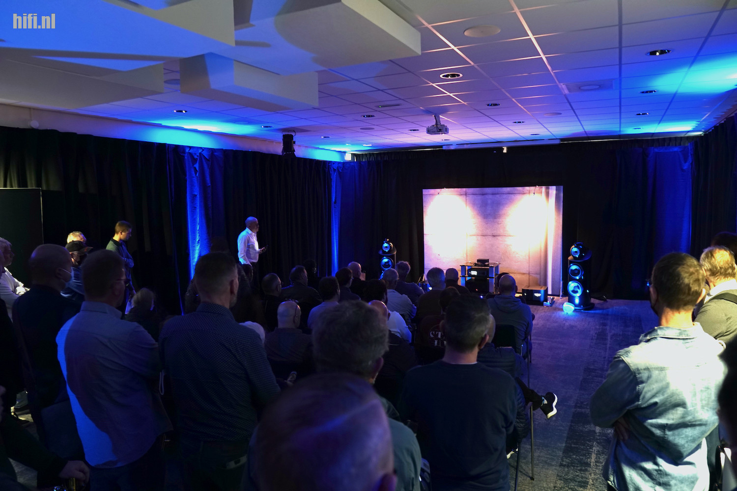 KEF-ambassadeur Johan Coorg is uiteraard een vaste waarde waar we altijd met veel plezier naar kunnen luisteren. Niet alleen vanwege wat hij vertelt, maar misschien vooral omdat hij altijd een boeiende selectie songs weet te selecteren. Je vervelen doe je nooit. Coorg had het onder meer over de prijswinnende trio bestaande uit de LS50 Meta, de veelzijdige LS50 Wireless II en de machtige KC62. Het enige spijtige: Anders Ertzeid, de nummer twee van Hegel die er meestal bij is in Tilburg, moest op het laatste moment wegens ziekte afhaken. Niettemin viel er veel te beleven in die Hegel-kamers, in het bijzonder in de demoruimte van de H590.