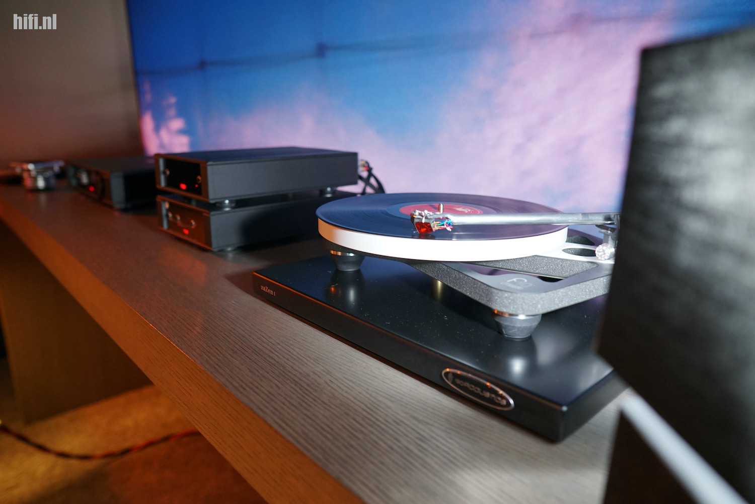 De draaitafel uit deze familie was een van de mooiste op de show, als je het ons vraagt. In deze kamer stonden wel meer knappe platenspelers, want Monitor Audio Nederland is ook de verdeler van de high-end Transrotor-spelers. Ook weer een lust voor het oog, op een andere manier wel, zoals je hierboven kunt zien.