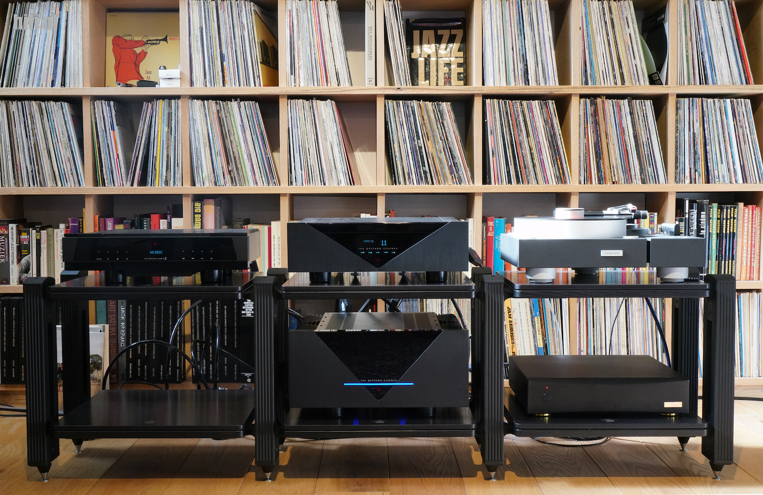 Rune: Ja, de meubels zijn nieuw in ons pakket, waar kabels er al jaren en jaren zijn. De meubels geven wij de Gryphon eigenschappen mee zoals duurzaam, dempend, stabiel en uiterlijk passend bij de elektronica. De StandArt meubels bestaan uit aluminium staanders en verder planken die slechts op de hoeken rusten op de staanders. Elke plaat is opgebouwd uit drie lagen: HDF als basis, Kerrock als topplaat en daartussen een laag sterk klevende en dempende bitumen. Kerrock is een hars (PMMA), waarin mineralen gevangen zijn. De sandwich constructie voert kinetische energie af. Het meubel is flexibel en groeit met de set mee. Voor de eindversterkers zijn plateau’s leverbaar om naast het meubel te plaatsen.