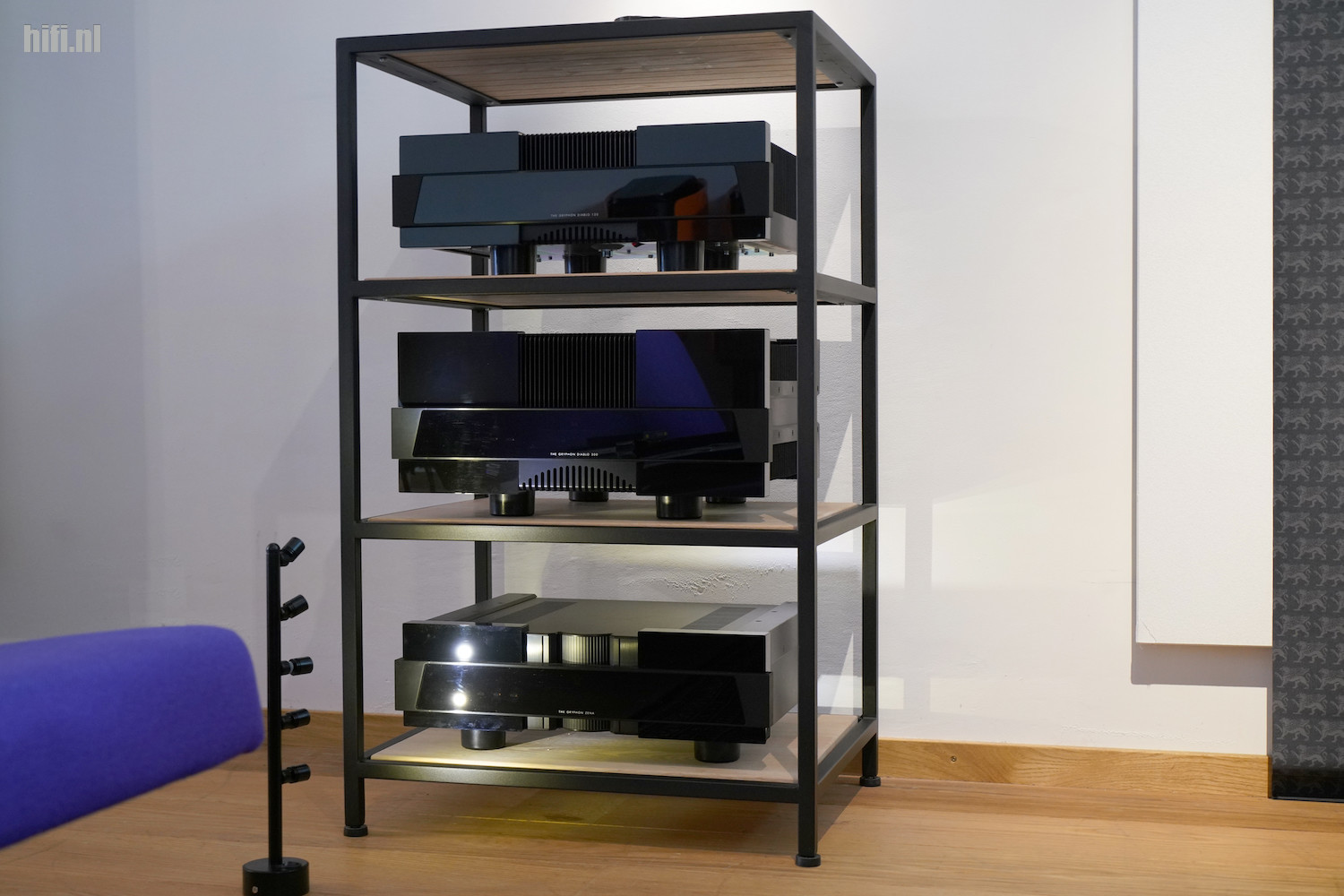 Rune: Ja, de meubels zijn nieuw in ons pakket, waar kabels er al jaren en jaren zijn. De meubels geven wij de Gryphon eigenschappen mee zoals duurzaam, dempend, stabiel en uiterlijk passend bij de elektronica. De StandArt meubels bestaan uit aluminium staanders en verder planken die slechts op de hoeken rusten op de staanders. Elke plaat is opgebouwd uit drie lagen: HDF als basis, Kerrock als topplaat en daartussen een laag sterk klevende en dempende bitumen. Kerrock is een hars (PMMA), waarin mineralen gevangen zijn. De sandwich constructie voert kinetische energie af. Het meubel is flexibel en groeit met de set mee. Voor de eindversterkers zijn plateau’s leverbaar om naast het meubel te plaatsen.
