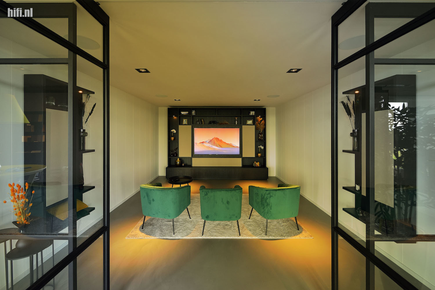 Teruggelopen naar beneden zijn daar nog drie luisterruimtes. De eerste is omgetoverd tot een bioscoop. Opnieuw geen luidsprekers te zien, ze staan achter het projectiedoek, onder het doek staan de subwoofers, de surround modellen zijn weggewerkt in de zijwanden. De ruimte is akoestisch volledig aangepast door Reference Sounds zelf.