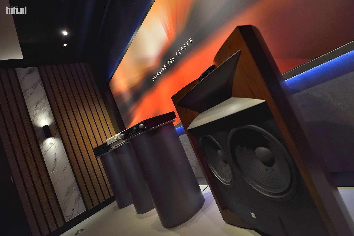 De eerste showruimte is voor JBL gereserveerd. Een schatje van een luidspreker staat op een stand, met alle JBL kenmerken als een hoorn voor mid/hoog, regelbaar volume voor de hoornunit en een blauw front.