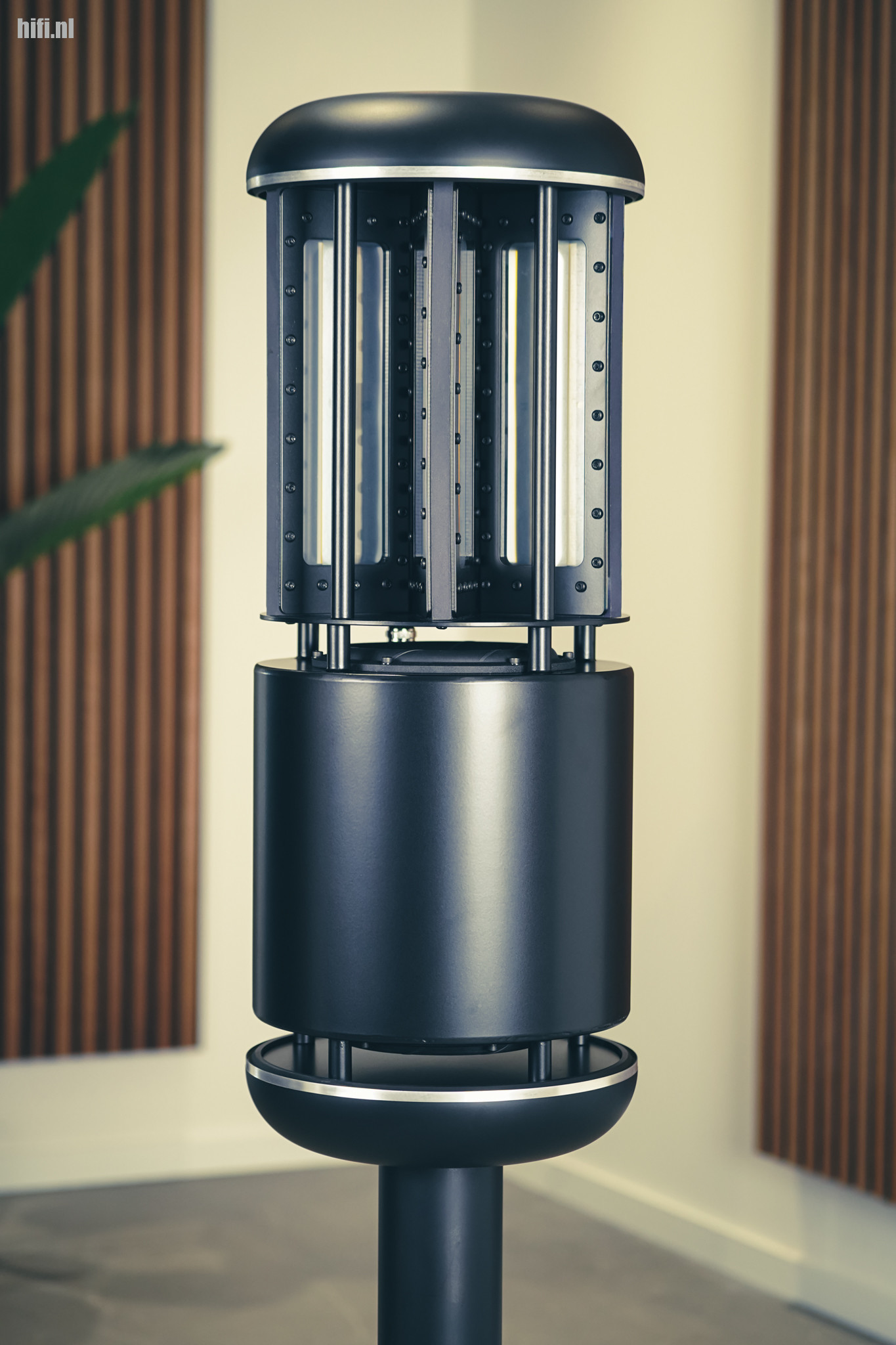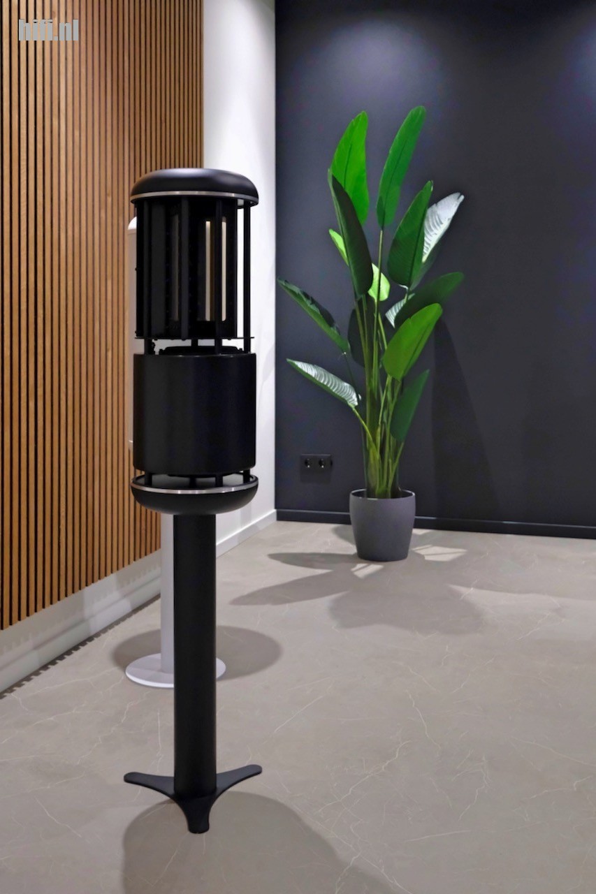 Nadat we in de ‘kraamruimte’ van Veddan eerste kennis hebben gemaakt met de interne organen van de Atom, begeven we ons naar de stijlvol ingerichte luisterruimte. Tijdens het officiële moment van onthulling krijgen we een goed beeld van de nieuwe Veddan Atom en kunnen deze nieuwe telg als geslaagde aanvulling op de luidsprekerlijn betitelen. Deze Atom maakt op ons de indruk van een soort van Mini-Origin. Nou ja, met een diameter van 25,5 en een hoogte van 69 centimeter (zonder voet) is dit niet écht mini. Deze nieuwe aanwinst uit de ‘skunk works’ van Veddan heeft wel een hoge schattigheidsfactor, zonder hierbij de traditionele look & feel van de originele Veddan Origin te hebben verloren.
