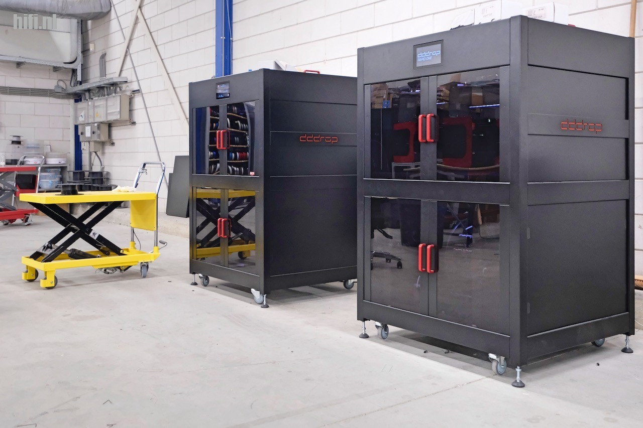 Wat wij niet wisten is dat het moederbedrijf waaronder Veddan valt een ingenieursbedrijf is dat onder andere deze industriële 3D-printers vervaardigt (de zwarte kasten rechts, red.). Printers in verschillende grootte die de hele wereld over worden verscheept en ook bij Veddan zelf worden toegepast in de eigen ontwikkel- en productieomgeving.
