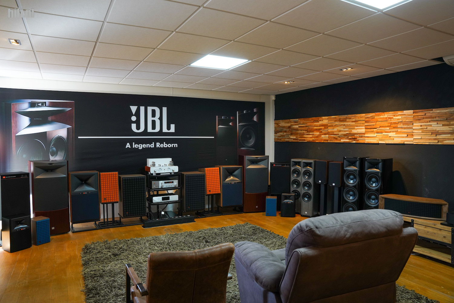 ‘Vrijwel’ mag hier inderdaad als hele subtiele kanttekening gezien worden. Wie naar het audiorack met aansturing kijkt, ziet daar boven en onder de -uiteraard aanwezig- JBL SA750 ook modellen van Melody en Atoll – maar in de categorie luidsprekers is het JBL, JBL, JBL.