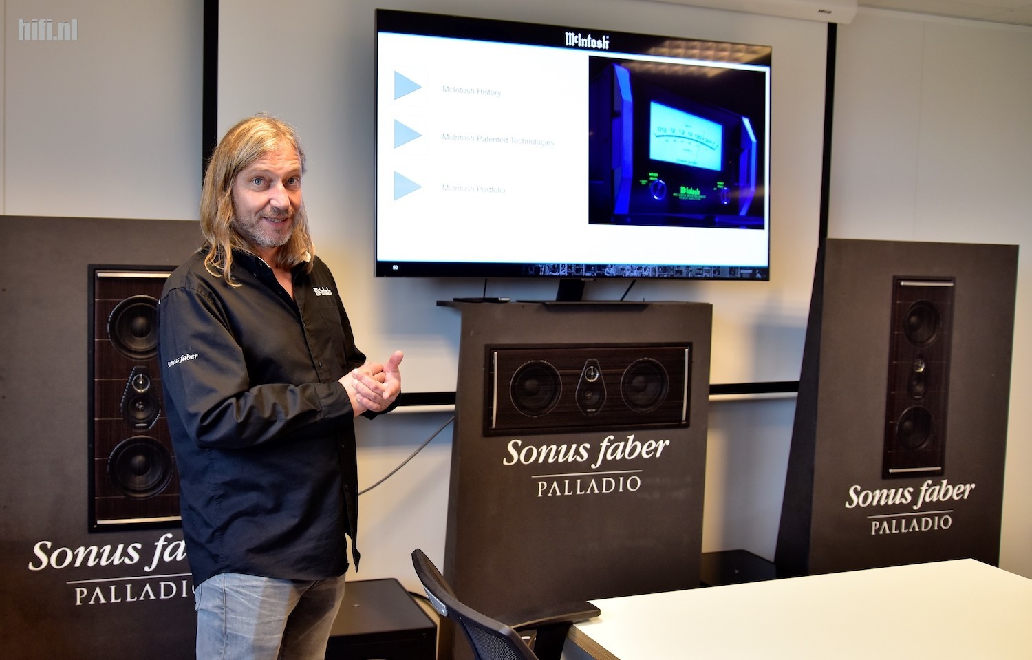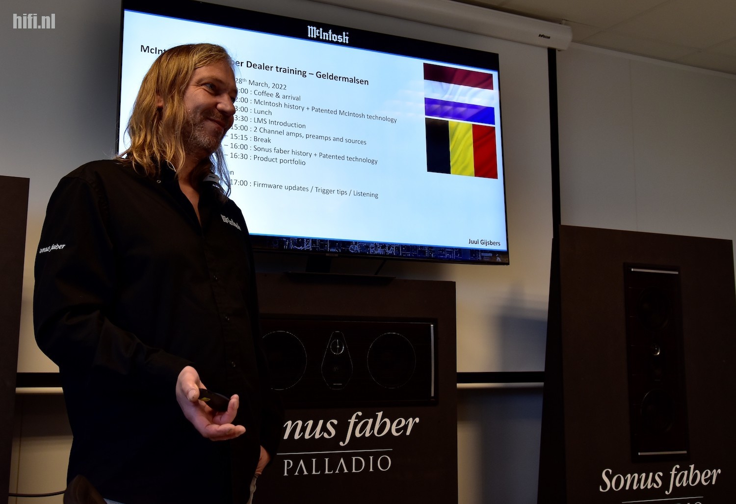 Hoe die opleiding voor dealers er aan toe gaat, heb ik zelf kunnen ervaren. Op uitnodiging van Fine Sounds Benelux kon ik deelnemen aan een McIntosh & Sonus faber training. Na zoveel jaar opnieuw op de schoolbanken, het leek me wel wat. Gelukkig kon ik de korte broek en het broodtrommeltje thuis laten en bleken de schoolbanken vervangen te zijn door een comfortabel ingerichte training room. Na een warme ontvangst met koffie en gebak werd ons groepje overgeleverd aan de immer enthousiaste Juul Gijsbers.