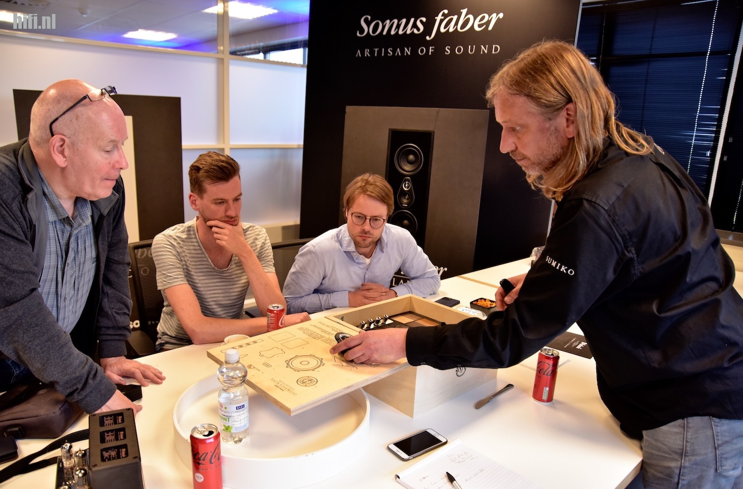 En dan is het tijd voor Sonus faber. De Italiaanse luidsprekerfabrikant met oog voor traditie, luxe en vakmanschap. Kenners weten dat Sonus faber gevestigd is in een regio waar veel muziekinstrumentenbouwers actief zijn, dat de vormgeving van de meeste speakers gebaseerd is op de vorm van een luit, dat de iconische rode kleur van de behuizingen met hun 30 hoogglans verflagen ontleend werd aan chique violen en dat de natuurlijke sound van Sonus faber ook wel the voice of Sonus faber genoemd wordt en dat de Italianen een levenslange garantie bieden op de snaren van de luidsprekergrillen. Wie het nog niet wist, leert het vandaag van Juul. Ook het feit dat Sonus faber haar geschoolde vakmensen het liefst omschrijft als artisans of sound. Kunstenaars die met nobele materialen zoals hout, leder en aluminium speakers bouwen die een lust zijn voor het oor en het oog. En dat alles handmade in Italia.