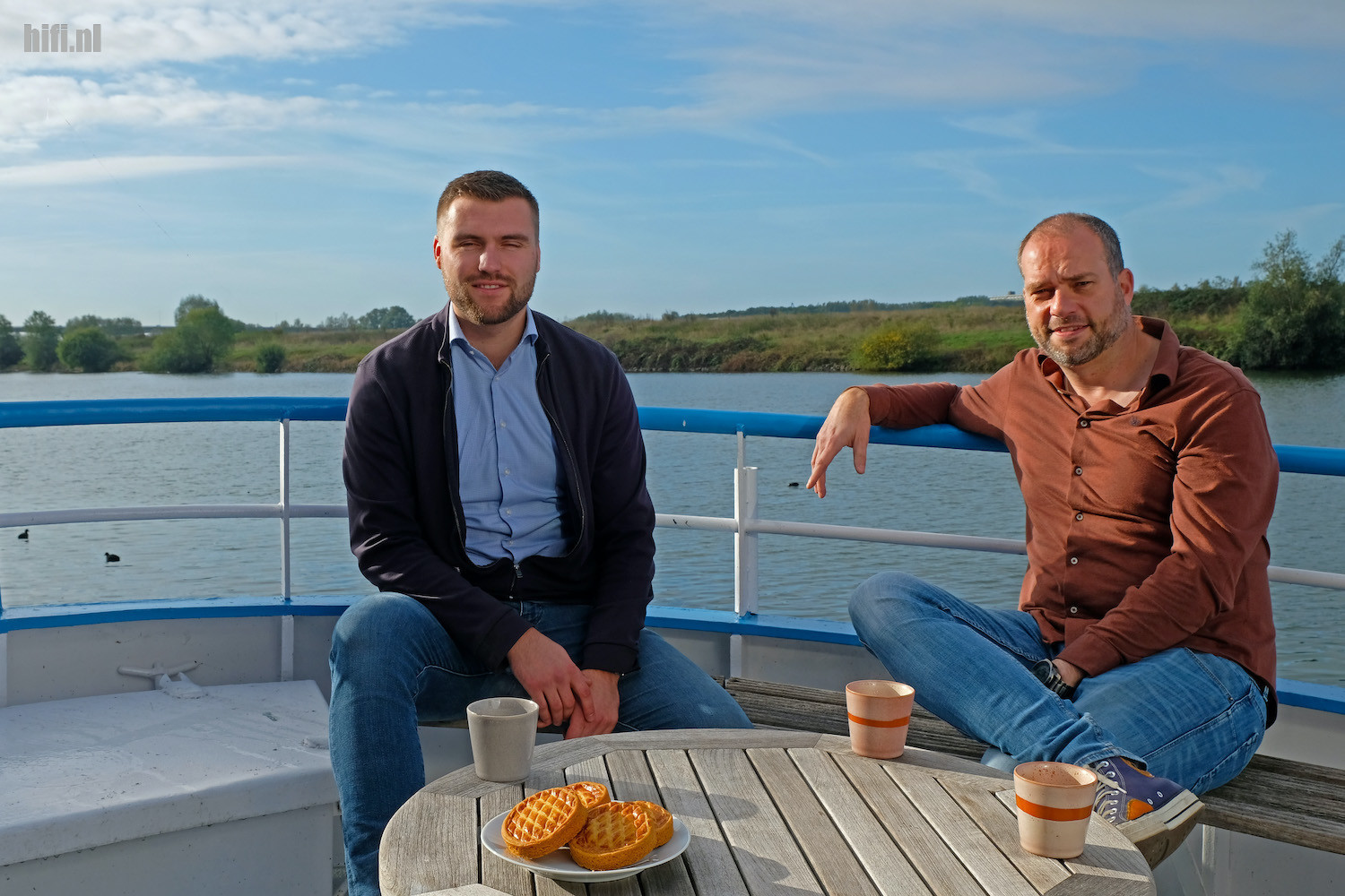 Voordat we de kajuit en luisterruimte in het voormalige ruim betreden, hebben we niet veel overredingskracht nodig om onder het genot van een kopje (erg goede!) koffie met op het voordek kennis te maken. Waarom ook niet. Het is een prachtige vrijdagmorgen en zo’n uitzicht over de uiterwaarden van de Rijn hebben we niet dagelijks. Tijdens de eerste kennismaking horen we de golven zachtjes tegen de stalen romp klotsen en beluisteren we de gedetailleerde zanglijntjes van ondefinieerbare vogeltjes ergens in de verte. We voelen ons vrij. Alsof we bij AudioHaven in een heel ander Nederland zijn aangekomen.
