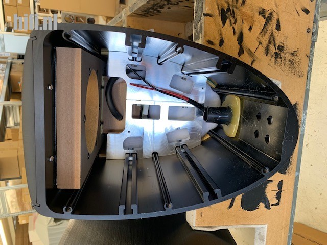 Daarna worden de openingen gefreesd waar de drivers in passen. Een line source model wordt gemaakt uit MDF, maar dan is nog steeds de baffle van aluminium om de drivers tegen te monteren. Wie een blik werpt in een geëxtrudeerde kast, waar later naadloos een boven en onderplaat op komt te zitten, ziet in de kast ribben zitten.