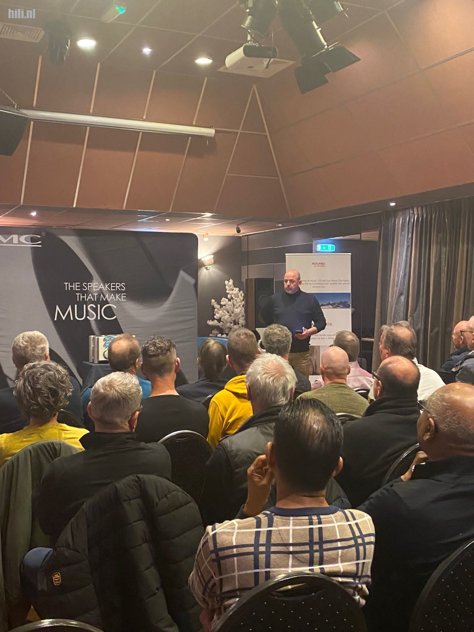 In de zaal staan de grootste Chord versterkers opgesteld. Twee machtige monoblokken en een voorversterker, de top van Chord onder de naam Ultima. Met een Dave DAC en Hugo M-scaler. Bron voor dit moois is een Grimm Audio MU1, bediend door Bert Bazuin die uitstekende playlists weet samen te stellen.