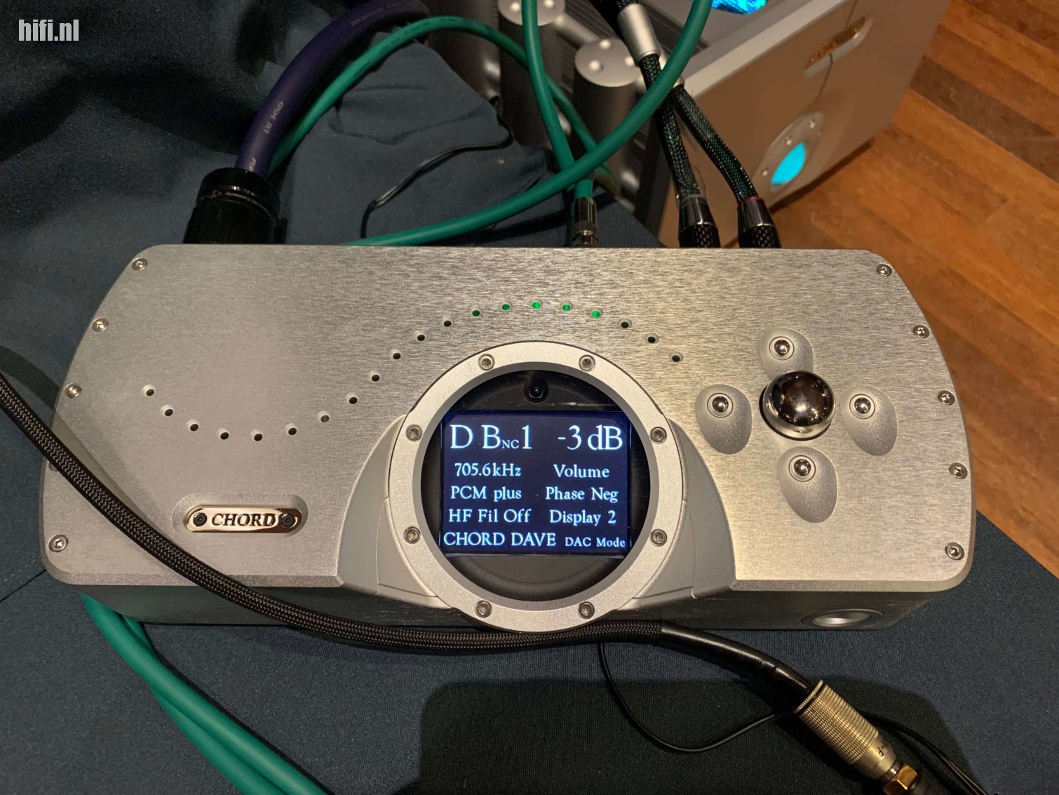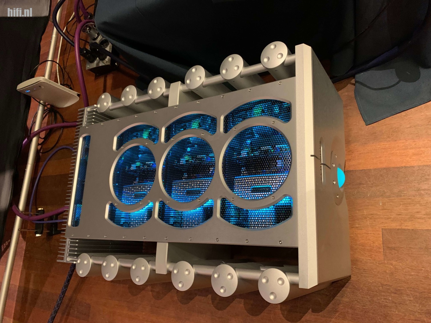 In de zaal staan de grootste Chord versterkers opgesteld. Twee machtige monoblokken en een voorversterker, de top van Chord onder de naam Ultima. Met een Dave DAC en Hugo M-scaler. Bron voor dit moois is een Grimm Audio MU1, bediend door Bert Bazuin die uitstekende playlists weet samen te stellen.