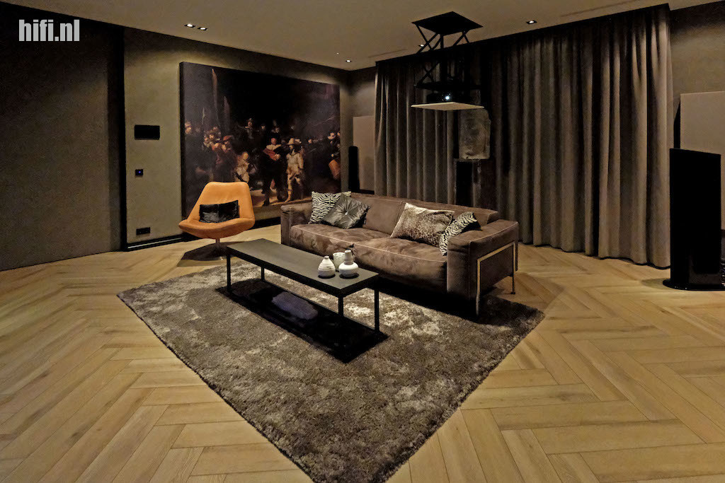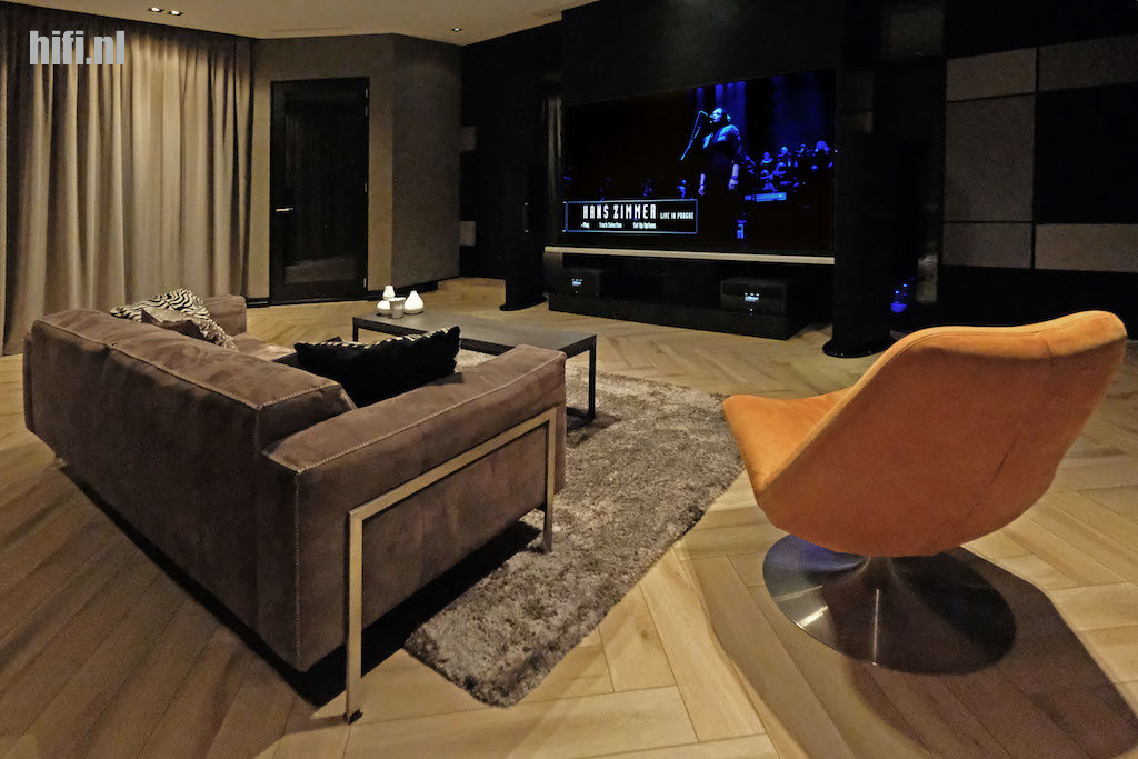 Nadat we hebben plaatsgenomen op de comfortabele driezitter centraal in de ruimte, valt het ons op hoe discreet alles op ons overkomt. Ja, er pronken twee flinke monoblokken onder het bovengemiddeld grote OLED-scherm. De luidsprekers hebben echter een rank en onopvallend voorkomen zodat we niet het idee krijgen in een technische ruimte plaats te nemen. Wanneer de sessie wordt gestart sluiten de dempende, met smarthome bestuurbare gordijnen met één druk op de knop.