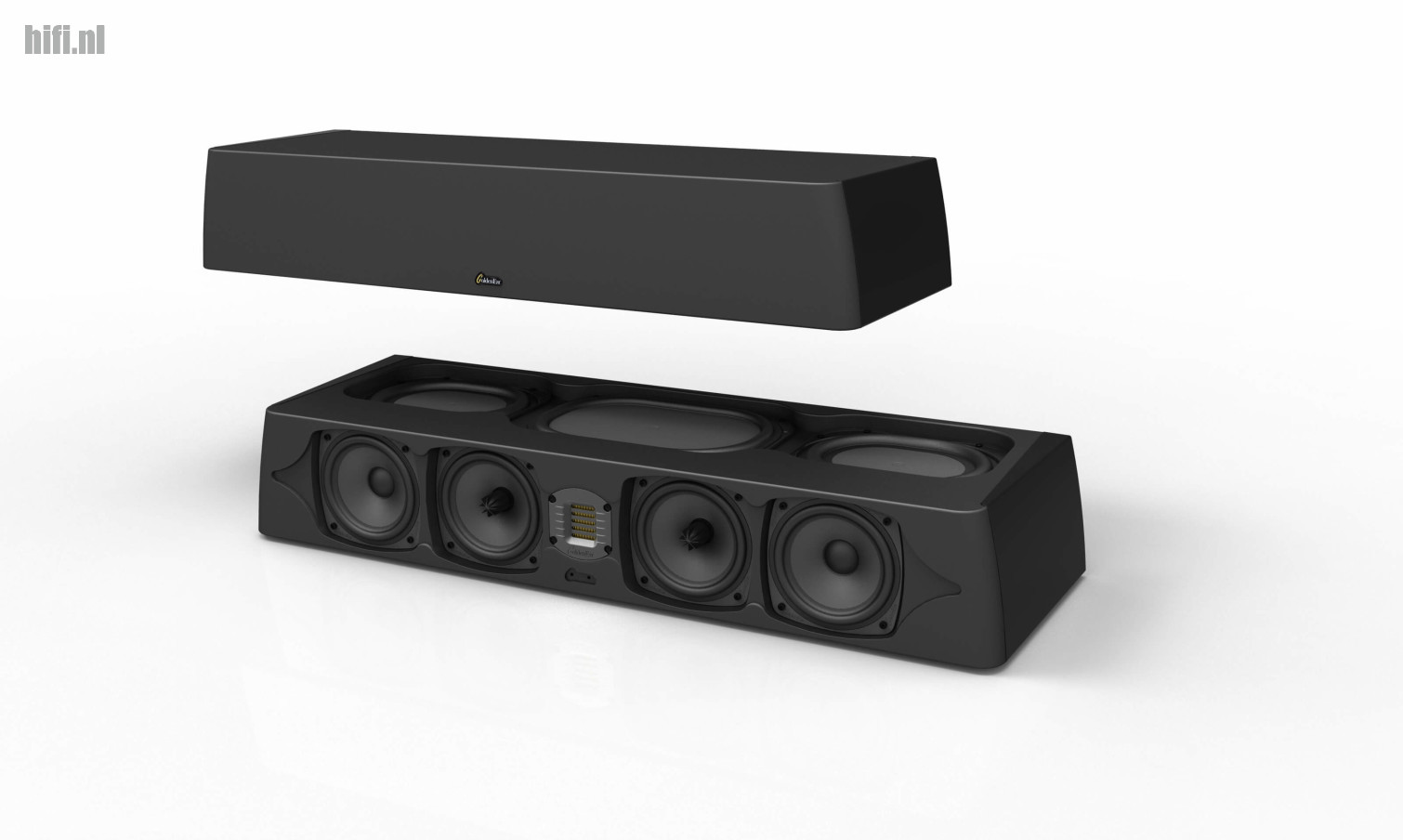 Alvorens we de thuisbioscoop beleven, nemen we de configuratie uitgebreid door. Mutrox heeft bij de frontkanalen gebruik gemaakt van GoldenEar Triton Reference luidsprekers (foto rechts, en klik hier voor een uitgebreide review van Ruud Jonker) en bij de achterkanalen van de GoldenEar Triton One.R. Er wordt geen gebruik gemaakt van een separate subwoofer. Meer laag is in deze ruimte namelijk niet nodig. Mutrox heeft namelijk gemeten dat de laagweergave van deze set tot maar liefst 12 Hertz doorloopt! Een GoldenEar SuperCenter Reference centerluidspreker (zie onder) wordt gebruikt voor het centerkanaal. De luidsprekers voor de frontkanalen worden full range aangestuurd door twee flinke Rotel Michi M8 monoblokken. De achterkanalen en center worden aangestuurd door een Trinnov Altitude 16 processor in combinatie met een Amplitude versterker. Bekabeling? Uiteraard van AudioQuest.