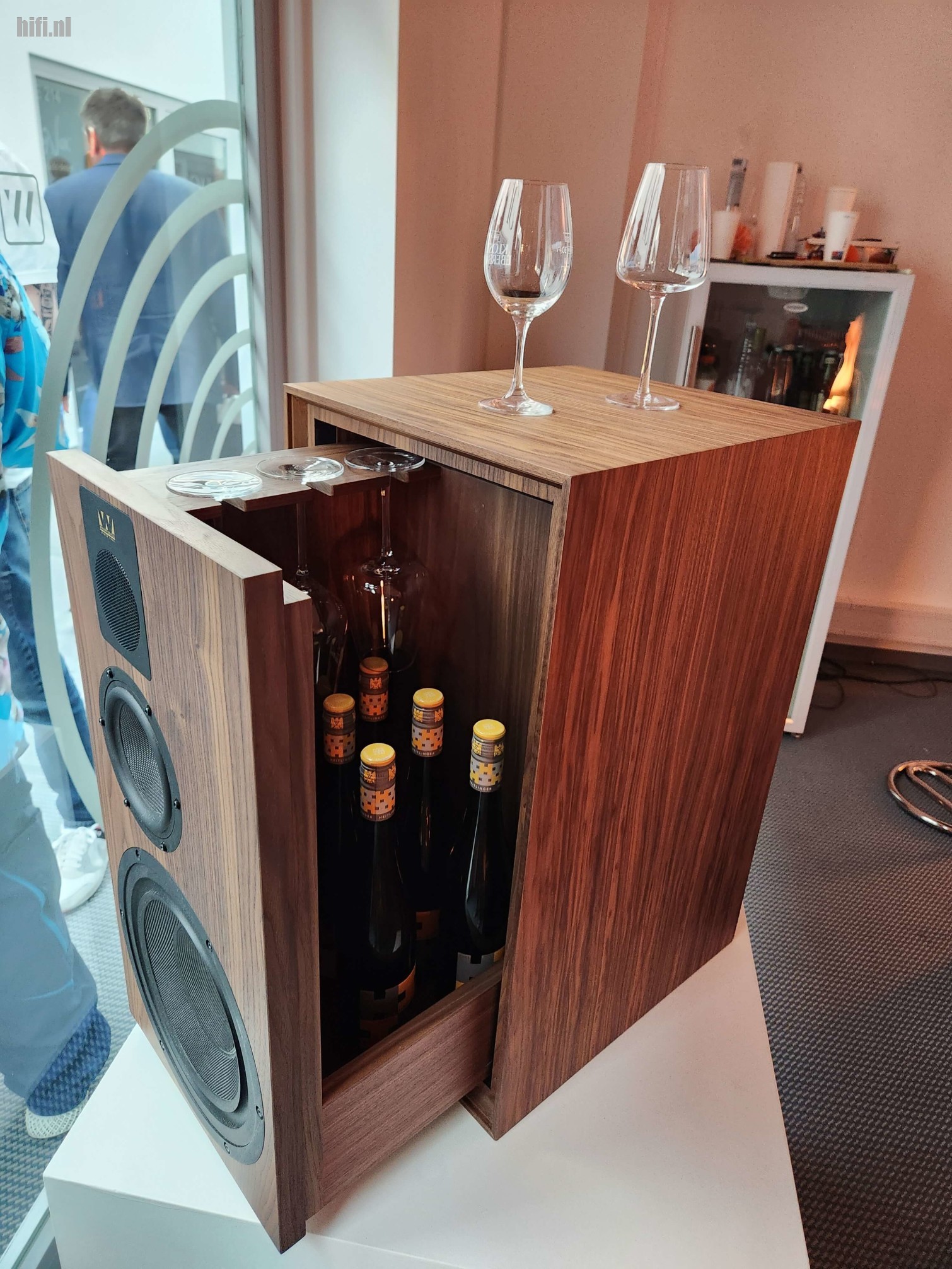 De relatie wijn-hifi is altijd een sterke geweest. Maar op de Wharfedale-stand ging het wel heel ver. Wel een leuk idee voor de doe-het-zelvers met een kapotte speaker op overschot.