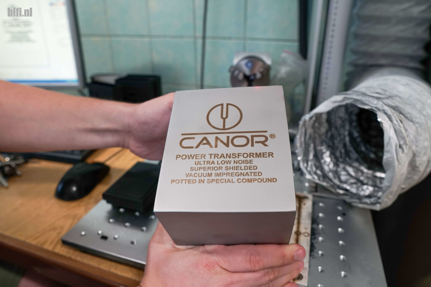 De fijne afwerking geldt ook voor de binnenkant. We zien piekfijn afgewerkte printplaten. Een blikvanger tijdens de rondleiding is ook het met laser gegraveerde Canor-logo op de metalen behuizing rond de transformator. Nu ja, ‘blikvanger’. Je ziet het enkel als je die versterker opent. Zelfs dat aspect is helemaal tot in de puntjes afgewerkt.