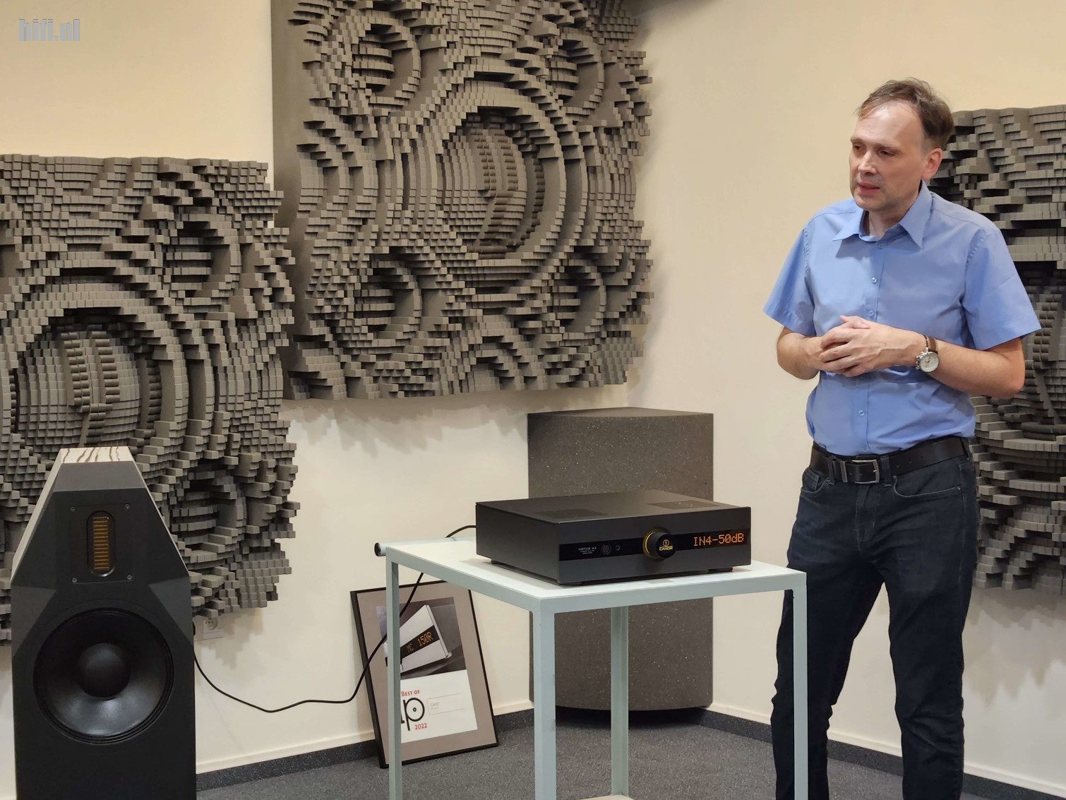 Een rondleiding door een hifi-fabriek eindigt altijd in een luisterruimte – dat is een wetmatigheid. Daar komen we een tweede bekend gezicht tegen: Karl-Heinz Fink. Een grote naam in de audiowereld, want als consultant heeft hij voor veel merken luidsprekerdesigns geoptimaliseerd.
