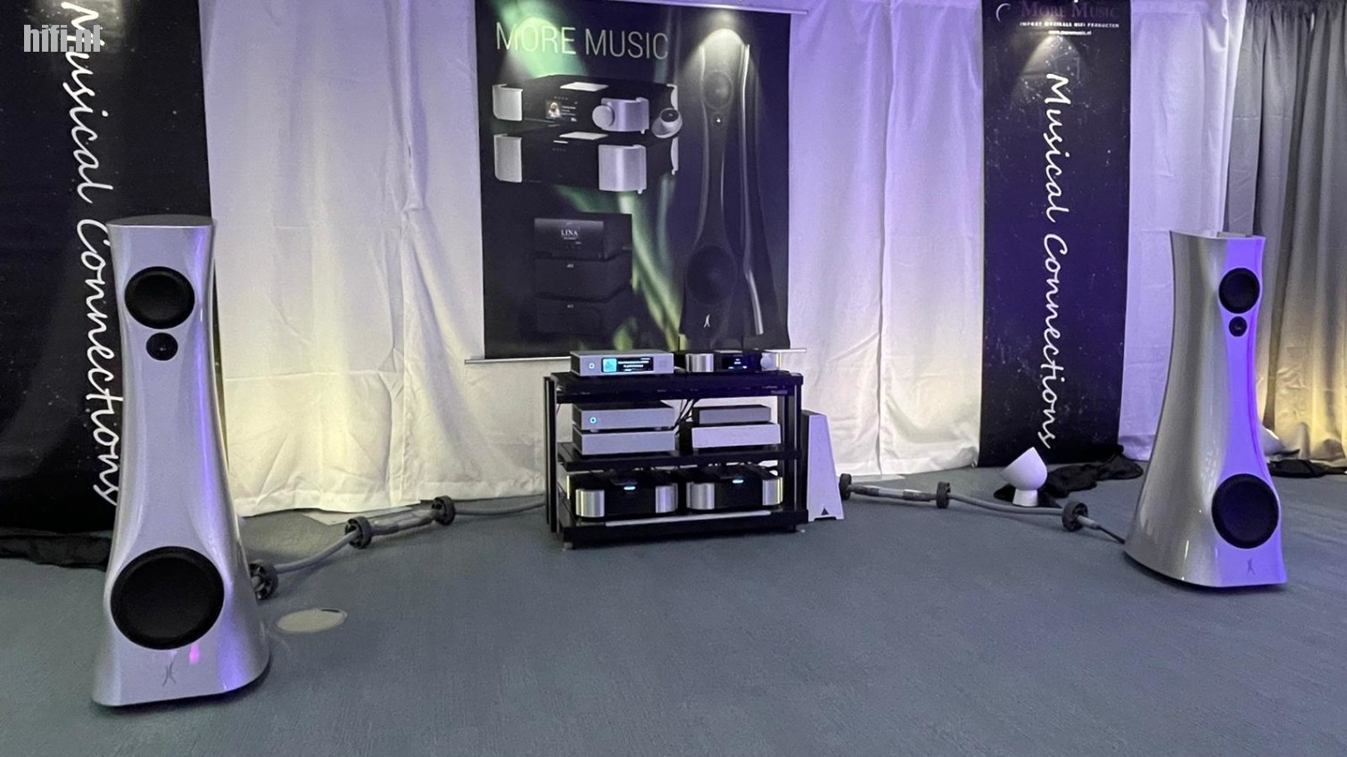 De set waar More Music mee demonstreert bestaat bijna volledig uit noviteiten van Estelon, Moon, Aurender, Shunyata en Finite Elemente. De muziek klinkt groot en transparant.