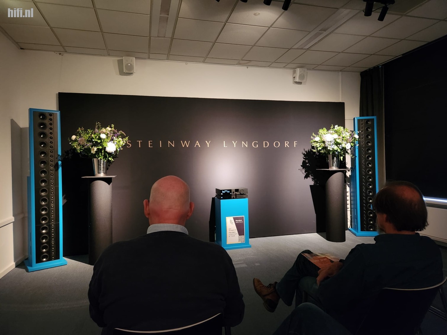 Een overvolle kamer voor de demo door Peter Lyngdorf himself. Maar misschien komen ze neit alleen voor de bekende Deen. HiFi Corner Trafing heeft hier een unieke opstellen van vier LS-1000-panelen per kant opgesteld aangestuurd door een TDAI-3400. Achteraan de kamer kun je ook de Cue-100 bewonderen, prachtige designspeakers met Purifi-drivers van Bruno Putzeys – de Belg is zelf ook op DAE, je vindt hem in de kamer waar de nieuwe Kii Seven opgesteld staat.