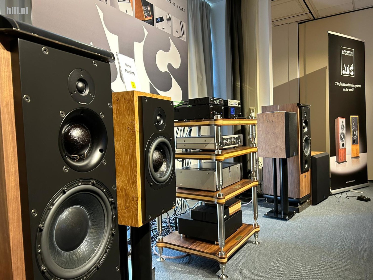 Naast al dit speakergeweld zijn er meer producten te bewonderen. Omdat Helios uit de Pro-hoek komt, weten zij bijvoorbeeld als geen ander wat akoestiek met een ruimte kan doen. Zo werd de ruimte hier onder handen genomen met producten van Mutec. Er staan bijvoorbeeld diverse elegante zuiltjes opgesteld, in de hoeken. Het zijn Audio Actieve Bass Absorbers, aka bass traps. Lage tonen hebben de neiging om samen een gezellig feestje in een hoek te beginnen. Het hoopt zich daar op, zeg maar. Door middel van het plaatsen van bass traps, elimineer je dat effect. Dat geeft ruimte en lucht in de luisterbeleving.