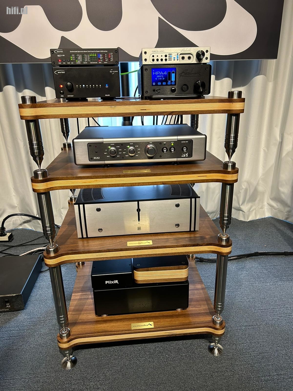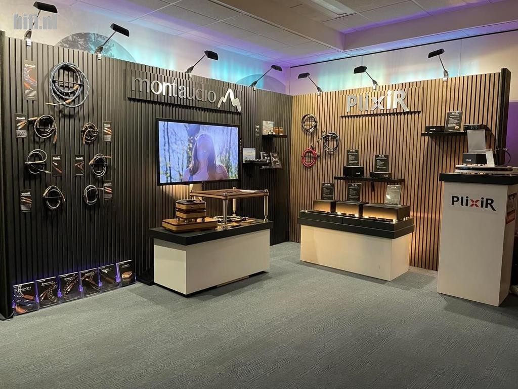 In dezelfde ruimte tot slot ook het team van Audio-Essence, dat in 2021 de markt bestormde met het merk Plixir. Hier in Veldhoven waren de mannen uit Friesland er dus weer bij, met niet alleen de nieuwste producten uit de hoge hoed van James Soh, maar ook aandacht voor een nieuwe aanwinst in het pakket: Montaudio, een breed pakket aan interlinks, speakerkabels, usb- en ethernetkabels maar ook prachtige hifi-racks, afstelbare trillingsdempers en unieke ground reference units uit Nieuw-Zeeland. Erg fraai!