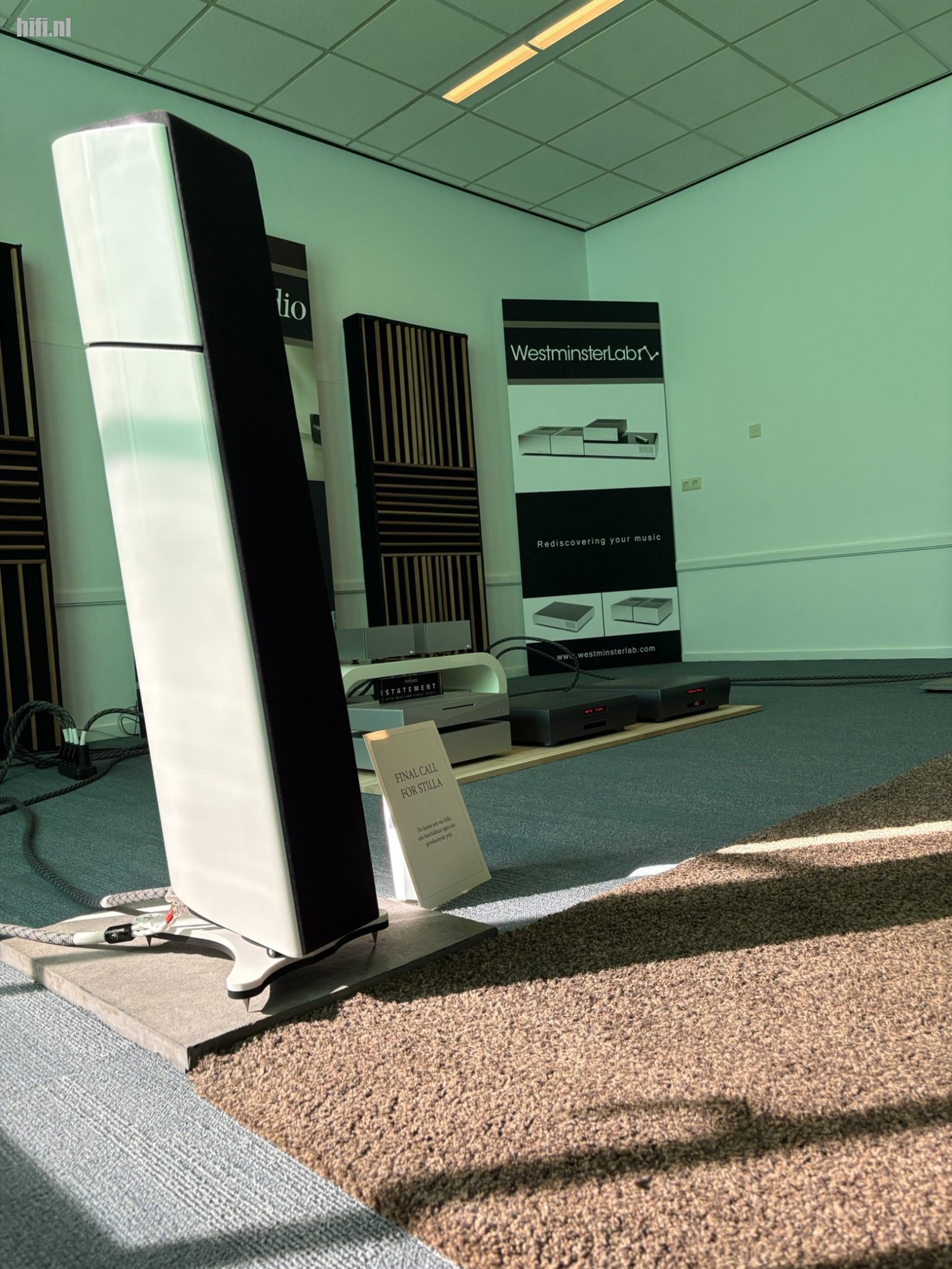 Ook zonder de nieuwe modellen van het merk ziet de kamer er weer geweldig uit, en staat er een prachtig paar Aequo Audio Stilla luidsprekers te spelen. Deze prachtige speakers staan aan weerszijde opgesteld, met in het midden diverse merken waar we ook wel warm van worden; WestminsterLab, Innuos en Playback Designs.