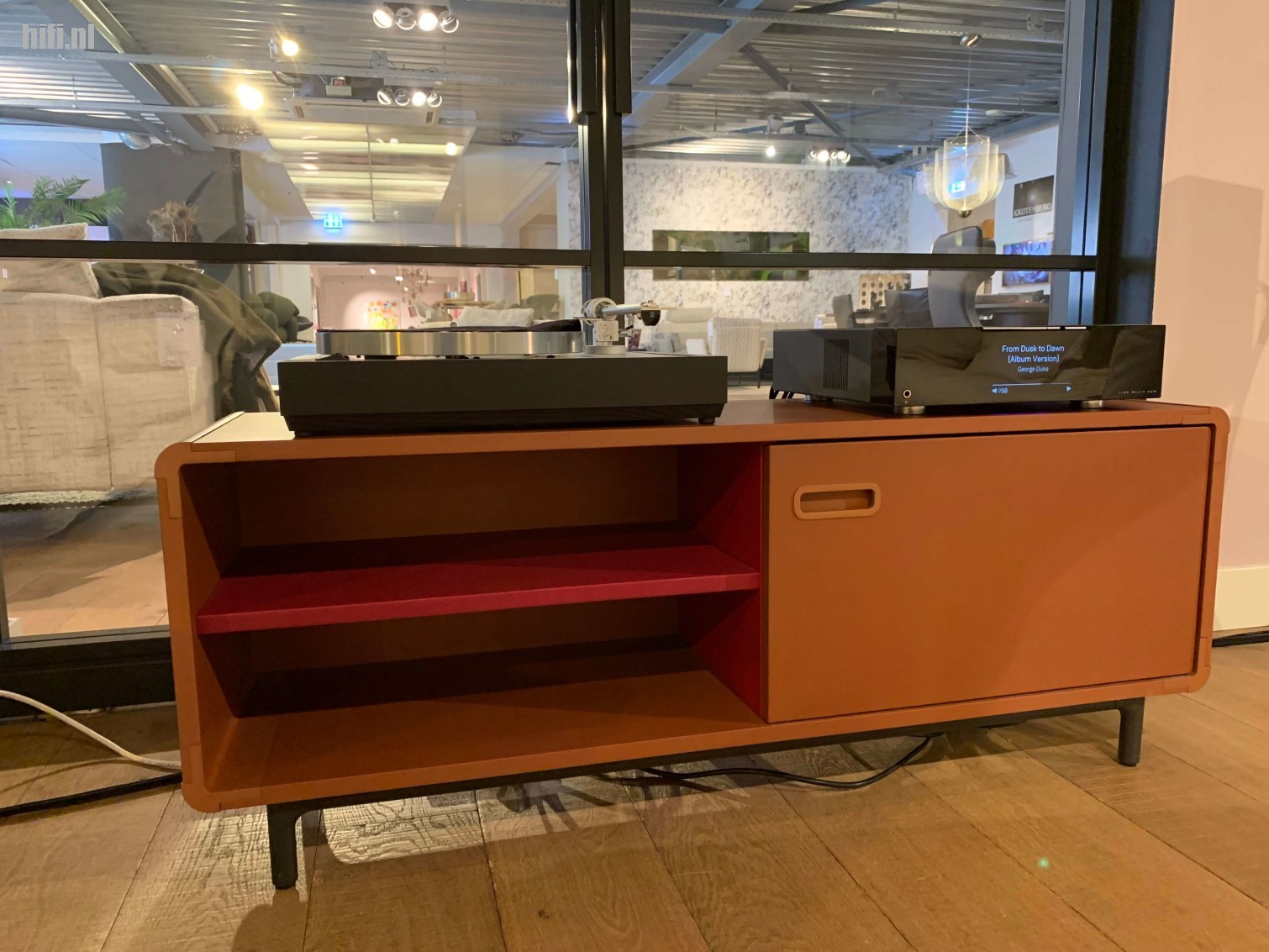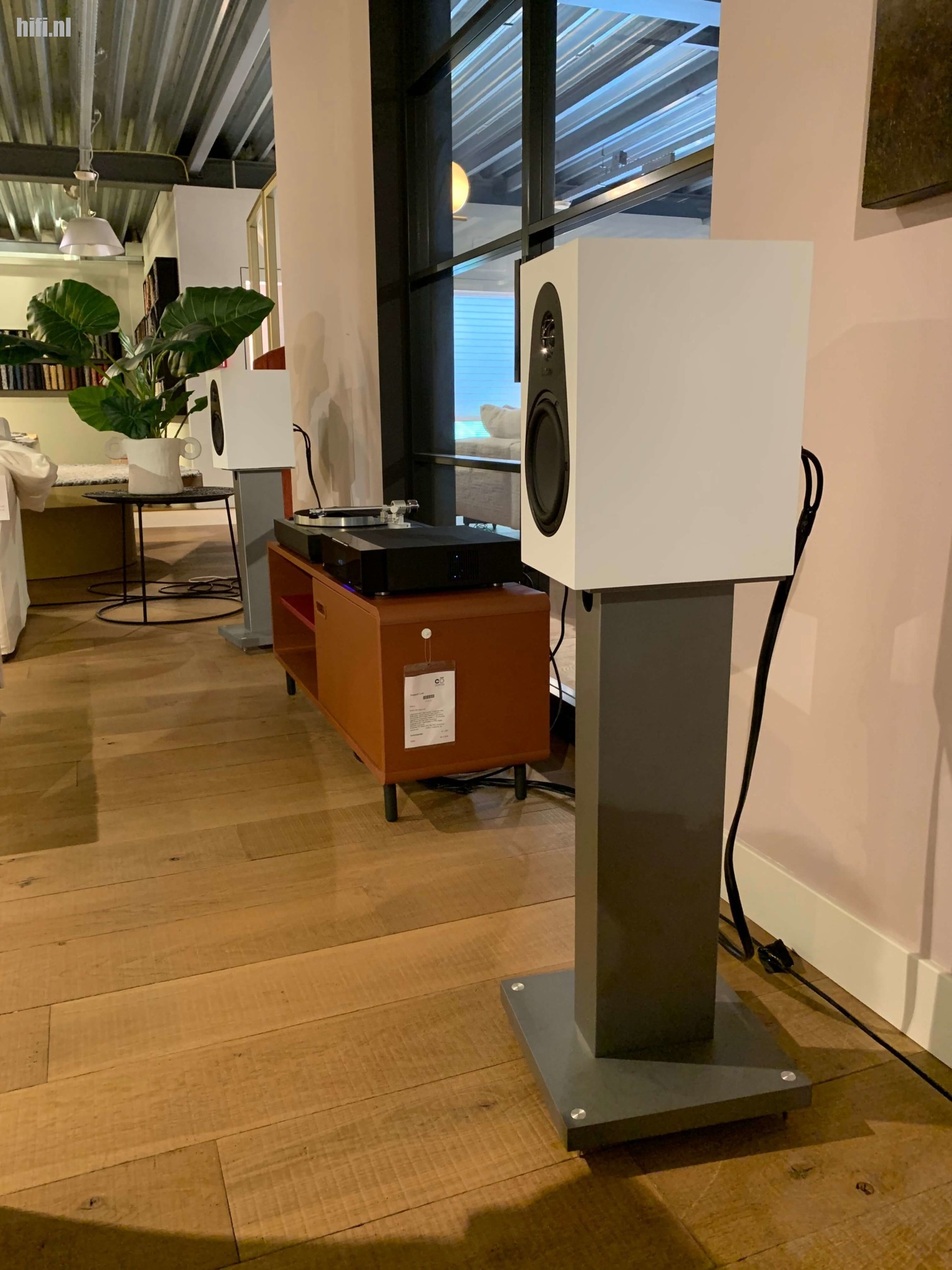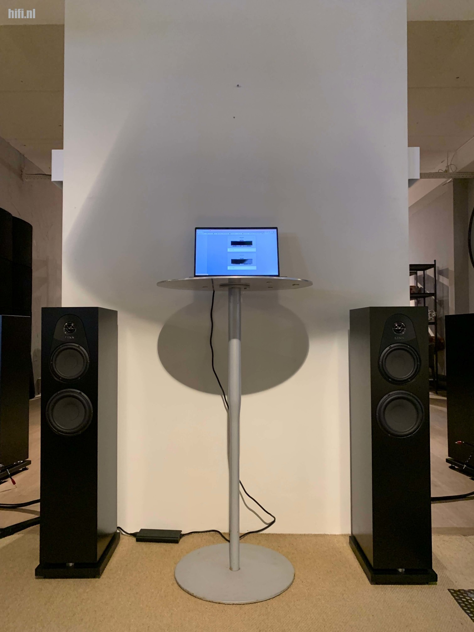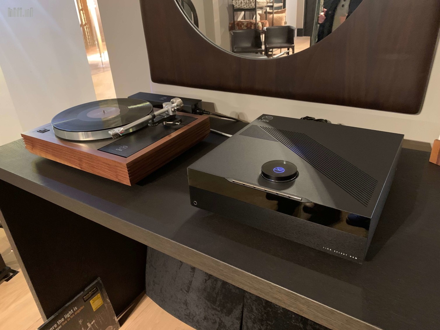 We verhuizen naar een ander deel van de winkel, lekker gaan zitten op de meubels waar Co van der Horst zijn handel van heeft. Hier staat een kleine Linn opstelling, een Majik streamer/dac/versterker en een tweetal 119 monitor luidsprekers. Waar uiteraard een Majik LP12 platenspeler naast staat.