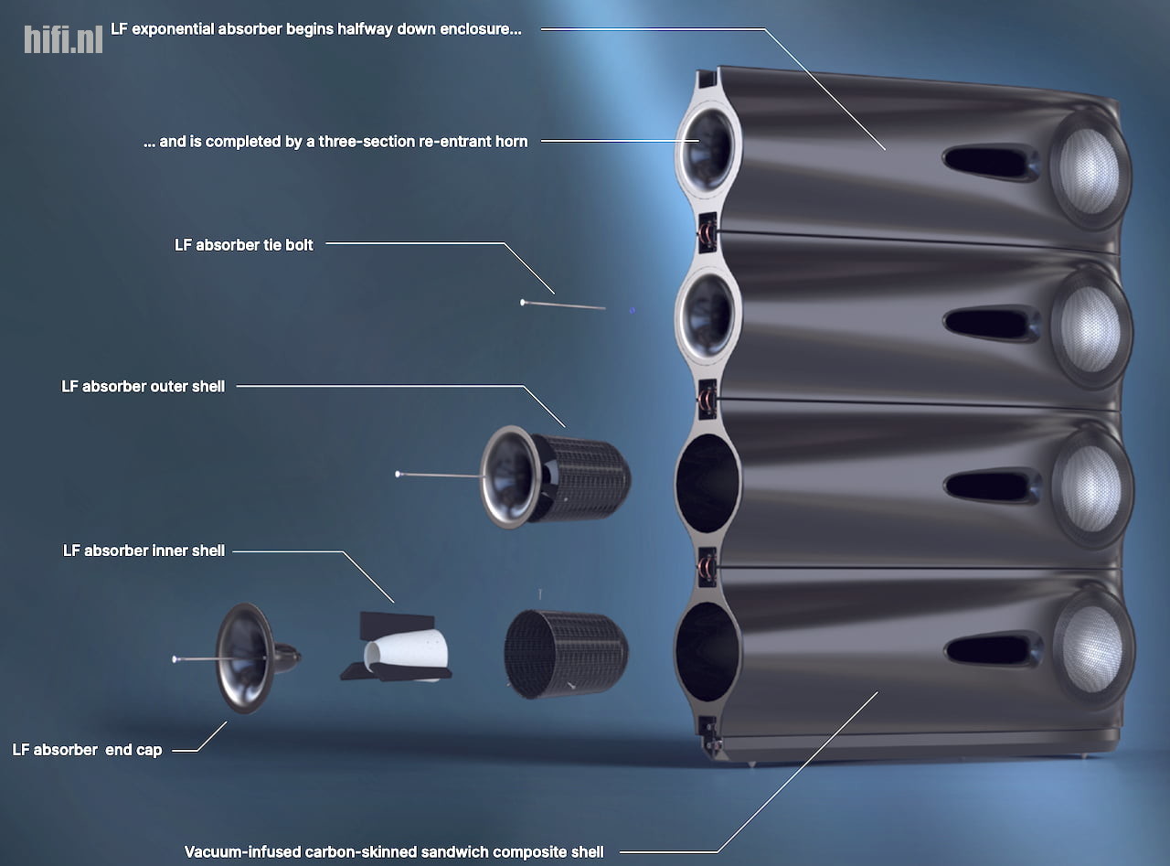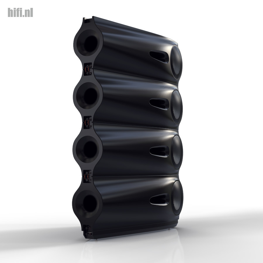 “Laurens werkt samen met een bedrijf waar alle berekeningen worden gedaan en alle protocollen aanwezig zijn. Hij laat speciale ferrofluid maken en demping. Alle conusoppervlakten hebben een vorm die afwijkend is van wat meestal gebruikt wordt. Hij gebruikt de vormen die in de natuur het sterkste zijn. Bij het laag is het lastiger om die 120 dB te halen. Zo'n driver mag niet drie tot vier centimeter naar buiten vliegen. Ze hebben uitgerekend wat de maximale uitslag van een woofer mag zijn om onvervormd 120 dB te halen. Dat is vier millimeter en kan dus niet met een enkele woofer. Daarom worden er in de Moya acht gebruikt. Bij fabrikanten die dat met een D'appolito proberen op te lossen werkt dat dus niet, althans als die lage vervorming je uitgangspunt is."