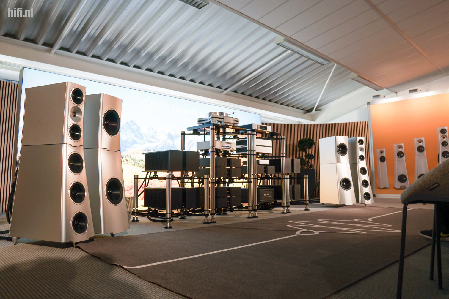 Het zijn meer beeldhouwwerken dan speakers, die massieve aluminium torens van YG Acoustics. Een geslaagde demo hier in deze grote kamer,