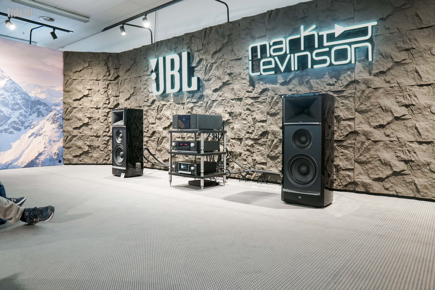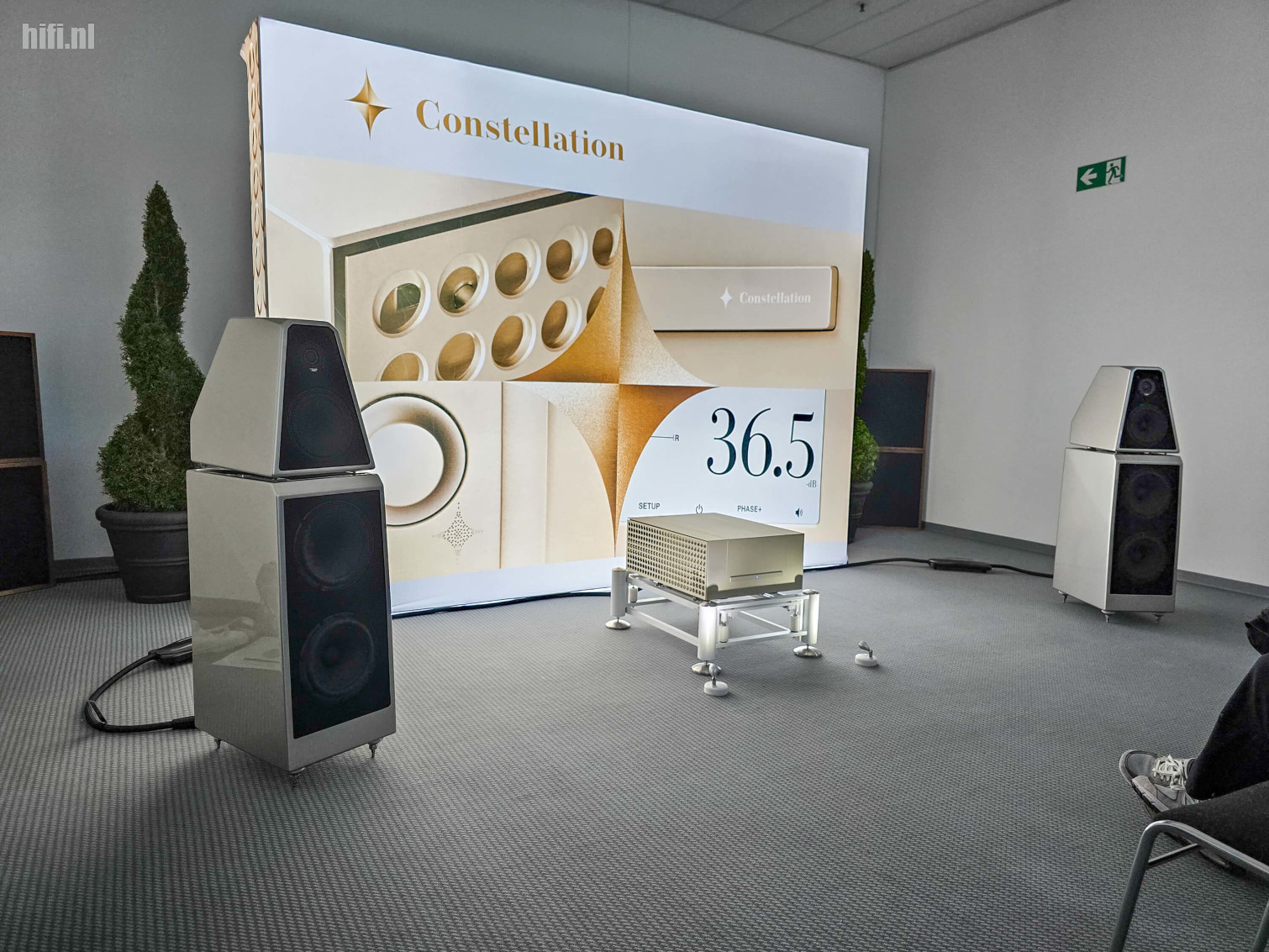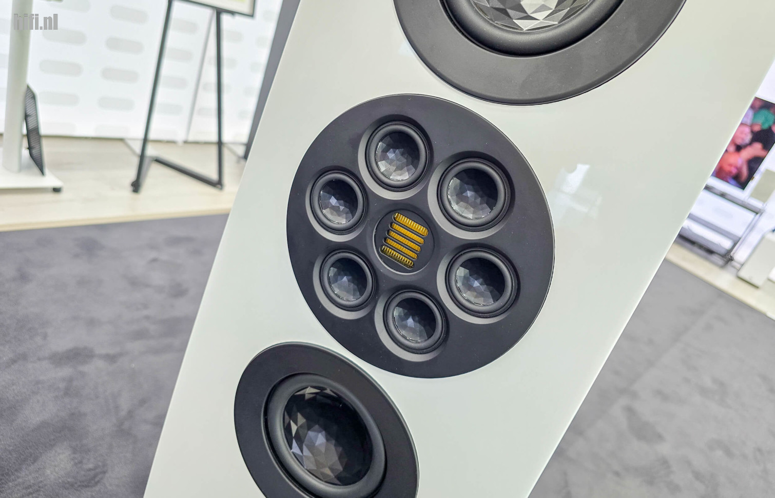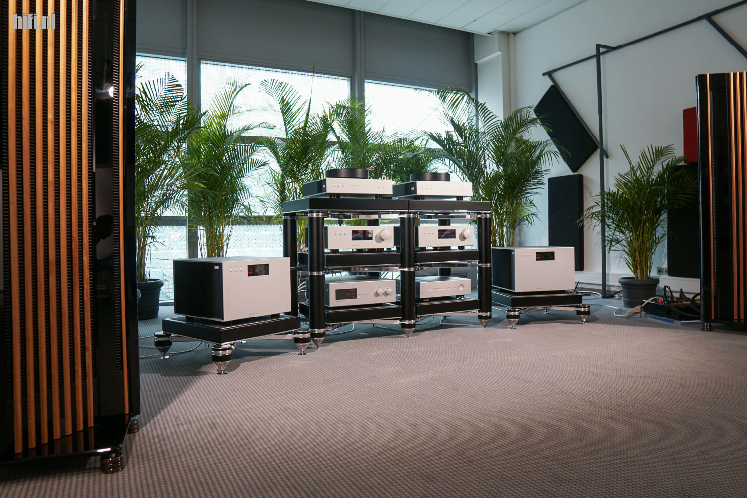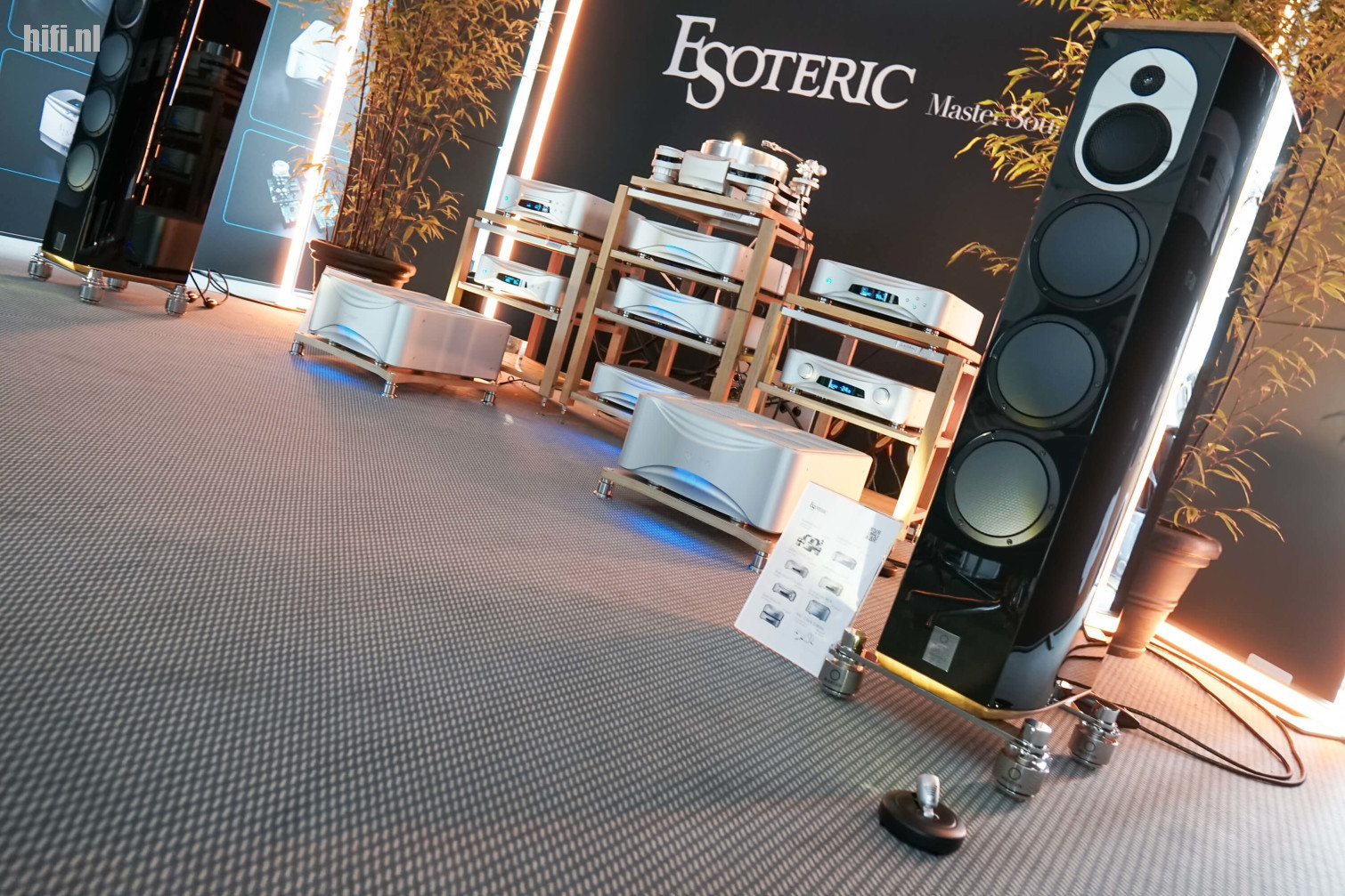 Dit systeem werd ter plekke beschreven als een 3 miljoen kostend geheel, maar die stelling blijkt toch genuanceerd te moeten worden. De geschatte waarde van het grote Clarisys Atrium-systeem op deze editie lag eerder rond 2,3 miljoen euro, op deze foto zie je een eenvoudigere opstelling - een prototype van de Aria - met twee torens per zijde en aanzienlijk minder eindtrappen (één paar, in plaats van vier). De actieve crossover die het merk toepast bij z'n complexere systemen kwam er ook niet aan te pas, waardoor je spreekt van een geschatte kostprijs van 350.000 euro.