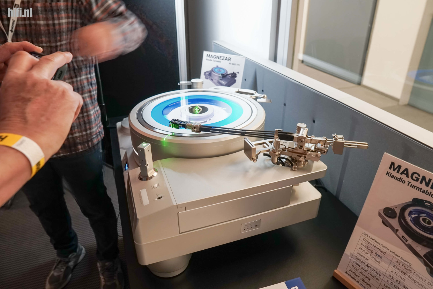 De speler is de Prototype ‘X’ (er is nog geen officiële naam), een 3-motoren aangedreven FMD (Free Magnetic Drive) systeem waarbij er geen mechanisch contact is tussen de aandrijving en het draaiplateau. Anders dan bij een Orion of Rondino is het chassis verbonden aan het motor compartiment eronder waardoor de positie van het FMD systeem exact vast staat. Bij een Orion of Rondino moet je het plaatsen met behulp van een bijgeleverde sjabloon en eventueel nog bijstellen. Dat vereist wel wat handigheid. Bij deze draaitafel is dit gemakkelijk. Net als bij een Alto is de toonarmbasis ‘On the fly’ in hoogte instelbaar. Ideaal als je moderne 180 gr persingen en oude platen door elkaar draait. Richtprijs rond de 40.000 euro. Optioneel een bijpassen rack met richtprijs 11.000 euro.