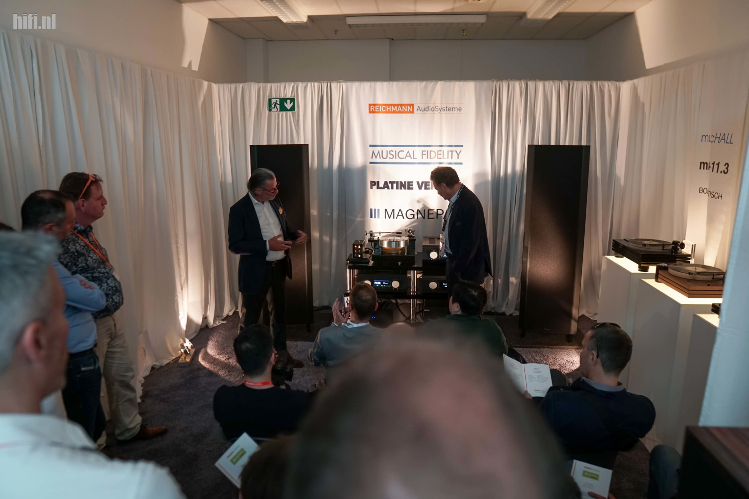 De foto is wat rommelig, want de kamer was overvol en de temperatuur bleef net onder 40°C hangen. Veel redenen om weg te gaan dus, maar de demonstratie van de Musical Fidelity Nu-Vista 600.2 met Magnepan-speakers door Pro-Ject-baas Heinz Lichtenegger hield de mensen toch binnen – ook omdat de man uitgebreid vertelde over z'n liefde voor een draaitafel die hem zoveel decennia geleden verleidde: een Franse Verdier.