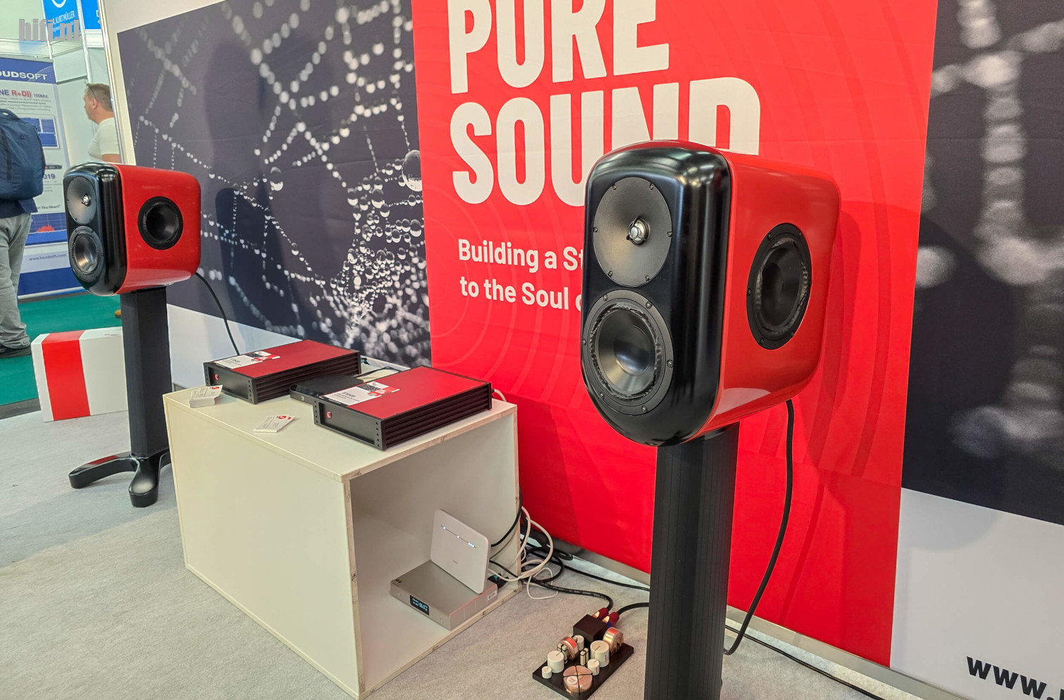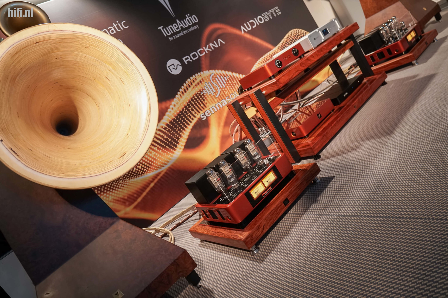 Tenzij we ons helemaal vergissen zie je nog net een stuk hoorn van de Anima van Tune Audio. Iedereen zat natuurlijk te kijken naar de prachtige knalrode toestellen; eigenlijk gaat het hier om spullen van verschillende merken. De Rhapsody geïntegreerde versterker van Trafomatic Audio is een bekend gezicht, hier werd het aangevuld met de Lara line-level preamp en onder meer een fraaie DAC van Rockna.