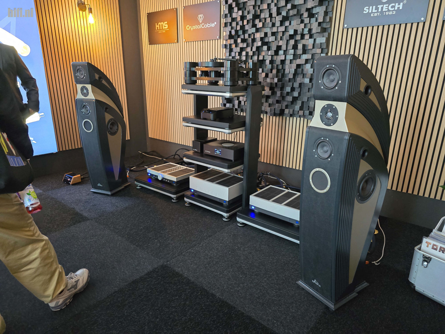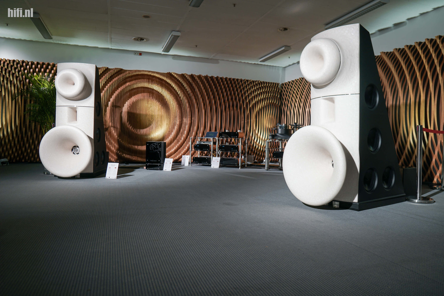 Deze Pallas-speakers van Aries Cerat zijn overweldigend. Ze torenden boven de aanwezigen uit, want ze zijn nog veel absurder groot dan deze foto laat uitschijnen. De grote hoorns op de voorkant vallen op, maar elke speaker bezit ook nog eens acht 12-inch woofers (vier per zijkant). Indrukwekkend, dat was wel het juiste woord.