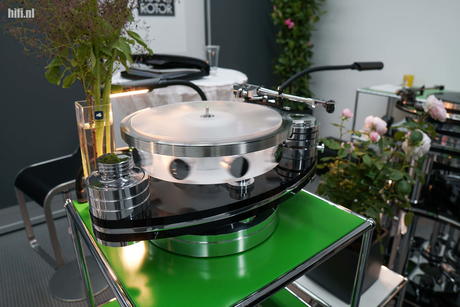Transrotor heeft altijd een mooie, luchtige kamer waar ze nagenoeg al hun platenspelers opstellen. Duitse bouwkwaliteit kon je hier perfect bewonderen, want de designs van het familiebedrijf uit Bergisch Gladbach zijn om van te snoepen. Het merk gelooft sterk in multimotor-aansturing, toch op z'n hogere modellen, voor een egalere draaibeweging. Dit exemplaar heeft er drie.