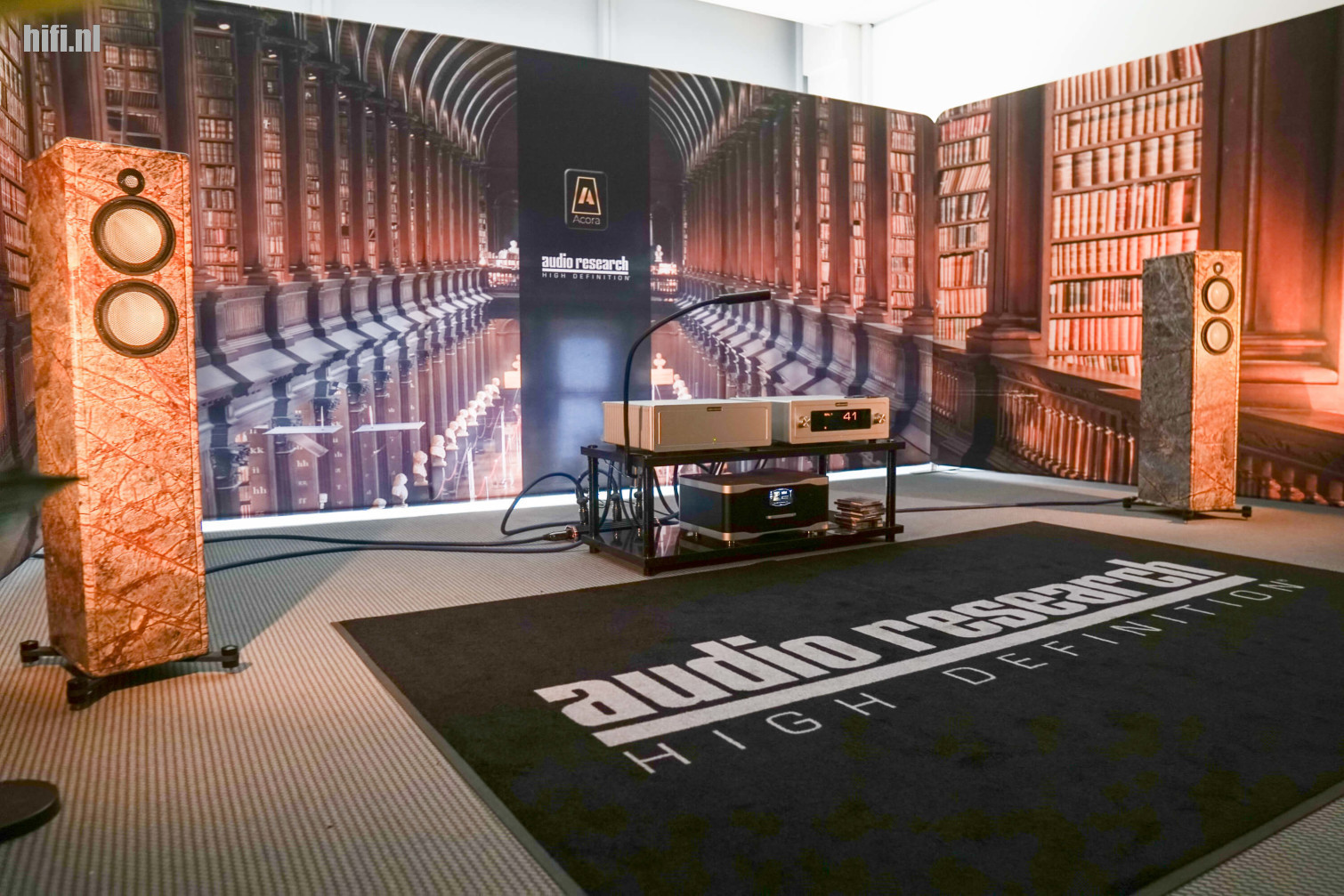 Ook Audio Research hield het relatief eenvoudig. De bibliotheekachtergrond zorgde voor een illlusie van diepte, waardoor de aandacht soms wat weggleed van de LS-2 voorversterker en S-100-eindtrap. Een huwelijk van buizen en solid-state, met een Wadax Studio Player als bron. Die opvallende speakers? MRC-2's van Acora.