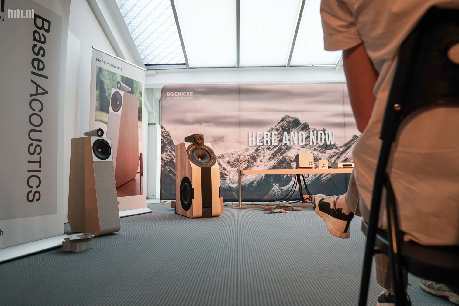 Boenicke bouwt speakers met een heel eigen esthetiek, en dat werd helemaal doorgetrokken in deze kamer met minimalistische opstelling. Eenvoud siert soms, en het was fijn om even te brein te ontlasten en hier gewoon muziek te beluisteren dat werd afgespeeld via de nieuwe AIO (de metalen kubus op de tafel).