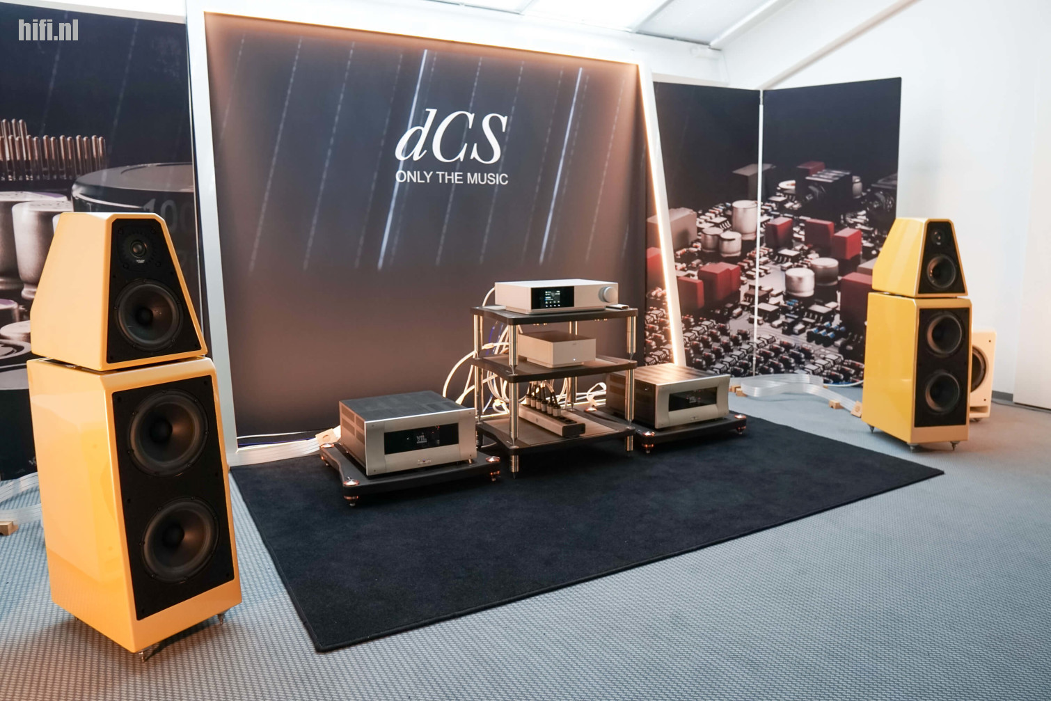 Bij dCS zijn ze net rond met het introduceren van Varèse, hun vlaggenschipsysteem dat uit vijf of zes aparte apparaten bestaat en ergens rond 250-300K kost. Niet op de foto is de wat later geïntroduceerde Varèse cd-transport die het systeem compleet maakt. Wat zie je wel? Dat is de LINA DAC X bovenaan de toren, de nieuwe netwerkspeler van de Britten, met daaronder een Lina-klok en een paar VLT-eindtrappen die een paar oranje Wilson Audio WATT/Puppy-speakers (met subs bijna uit beeld) hemels aanstuurde.