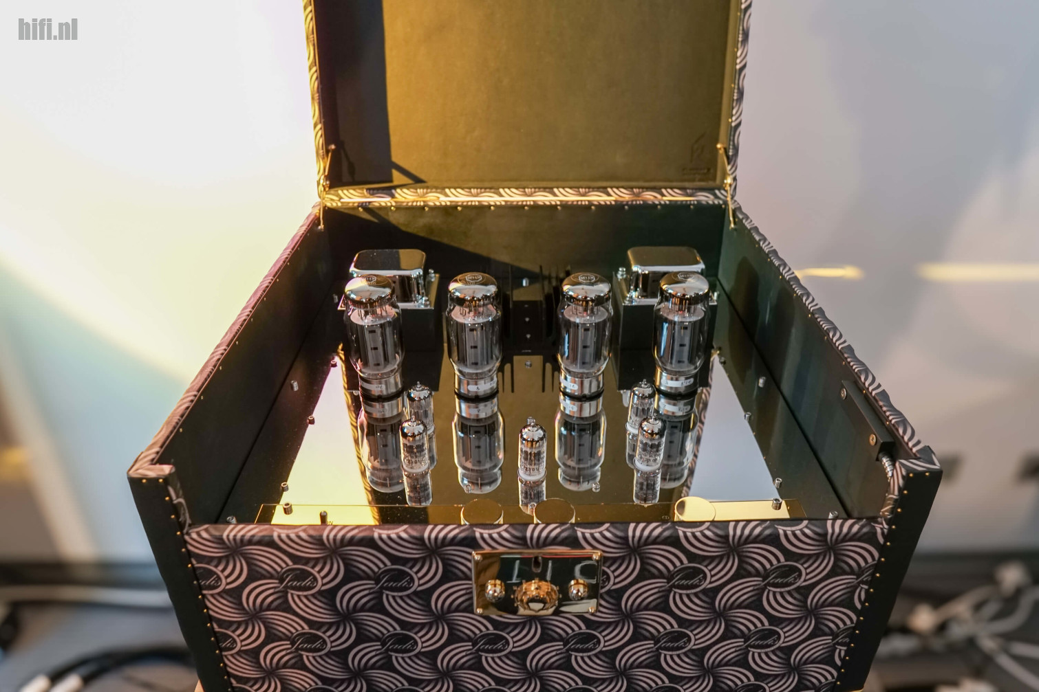 Deze versterker kwamen we tegen in de kamer van Davis Acoustics, een Franse luidsprekerbouwer die gerust wat meer aandacht mag verdienen. Davis en Jadis werken nauw samen, en voor de show bouwde die laatste een bijzonder versterker in een koffertje met pseudo Louis Vuitton-stijl. Let op het Jadis-logo dat mee in het decoratieve patroon is verwerkt.