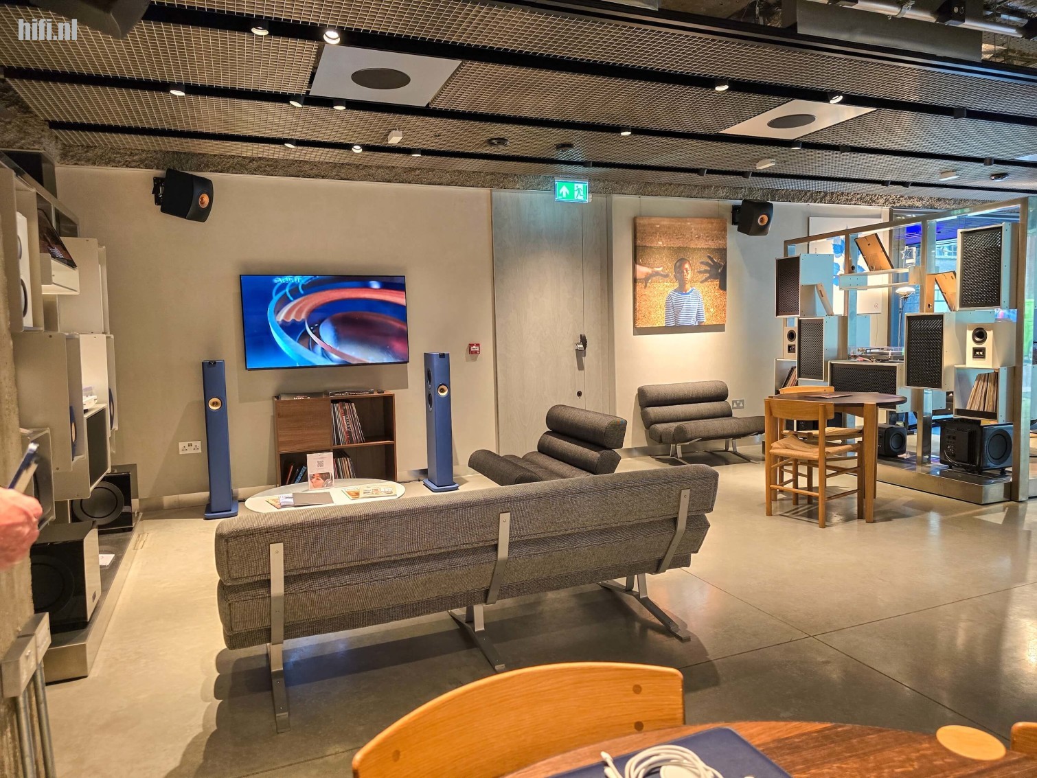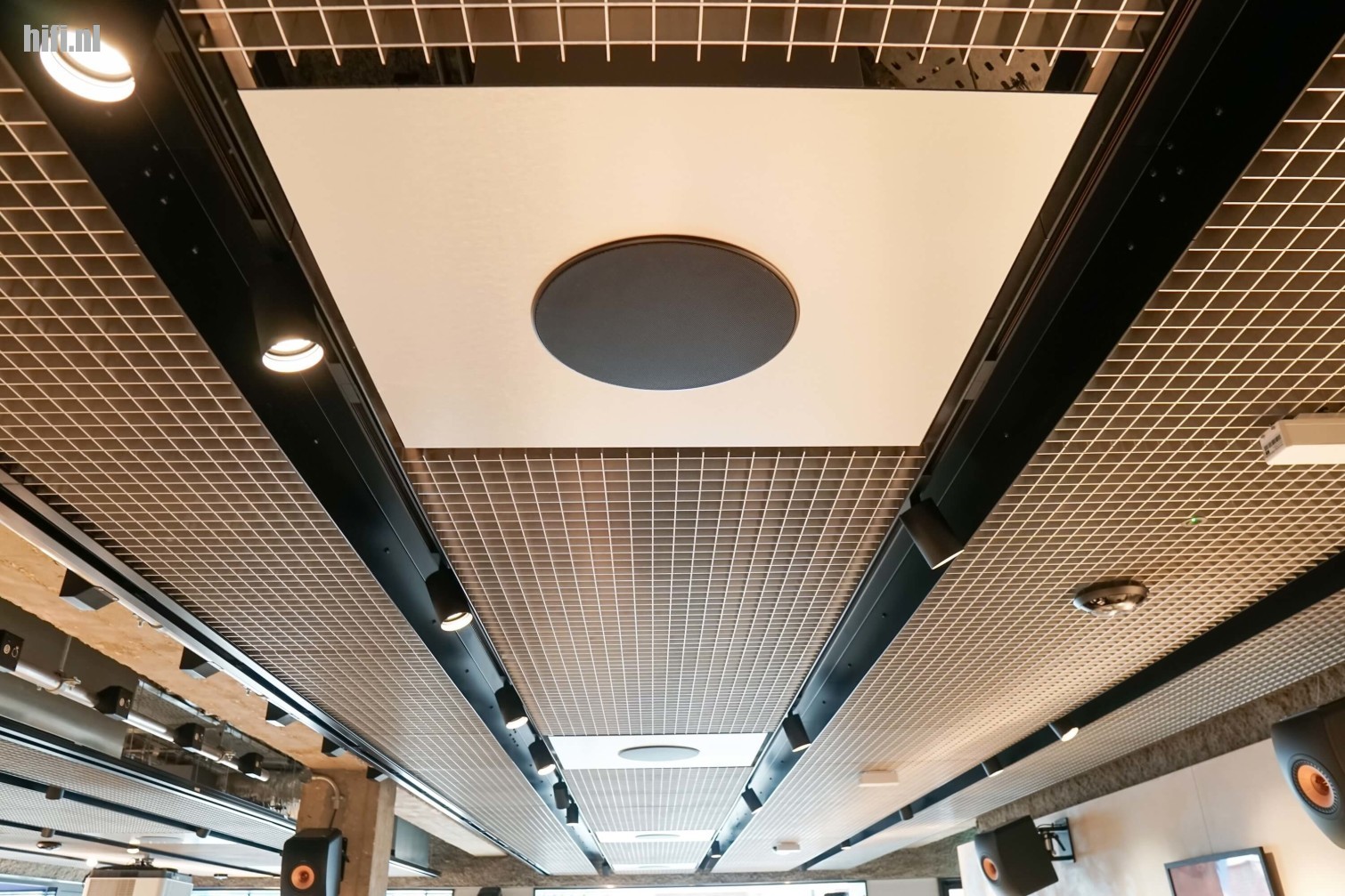 Ook de akoestische ingrepen zijn op een heel hoog niveau. Hier geen typische panelen om het geluid te dempen of diffusen, wel zaken als een laag op het plafond dat lijkt op beton maar eigenlijk een soort akoestisch schuim is. “Onder de betonnen vloer zit bovendien een geluiddempend membraam, waardoor we de ruimte eigenlijk hebben omgebouwd tot een soort akoestische cocon.” Het viel inderdaad wel op dat de grote ruimte die The Gallery en de KEFé zijn, toch heel natuurlijk klonken en niet galmden. Best uitdagend om dat geregeld te krijgen, maar het is de ontwerpers van KEF gelukt.