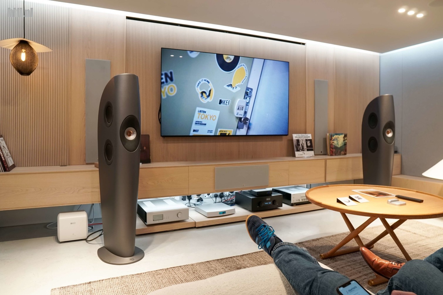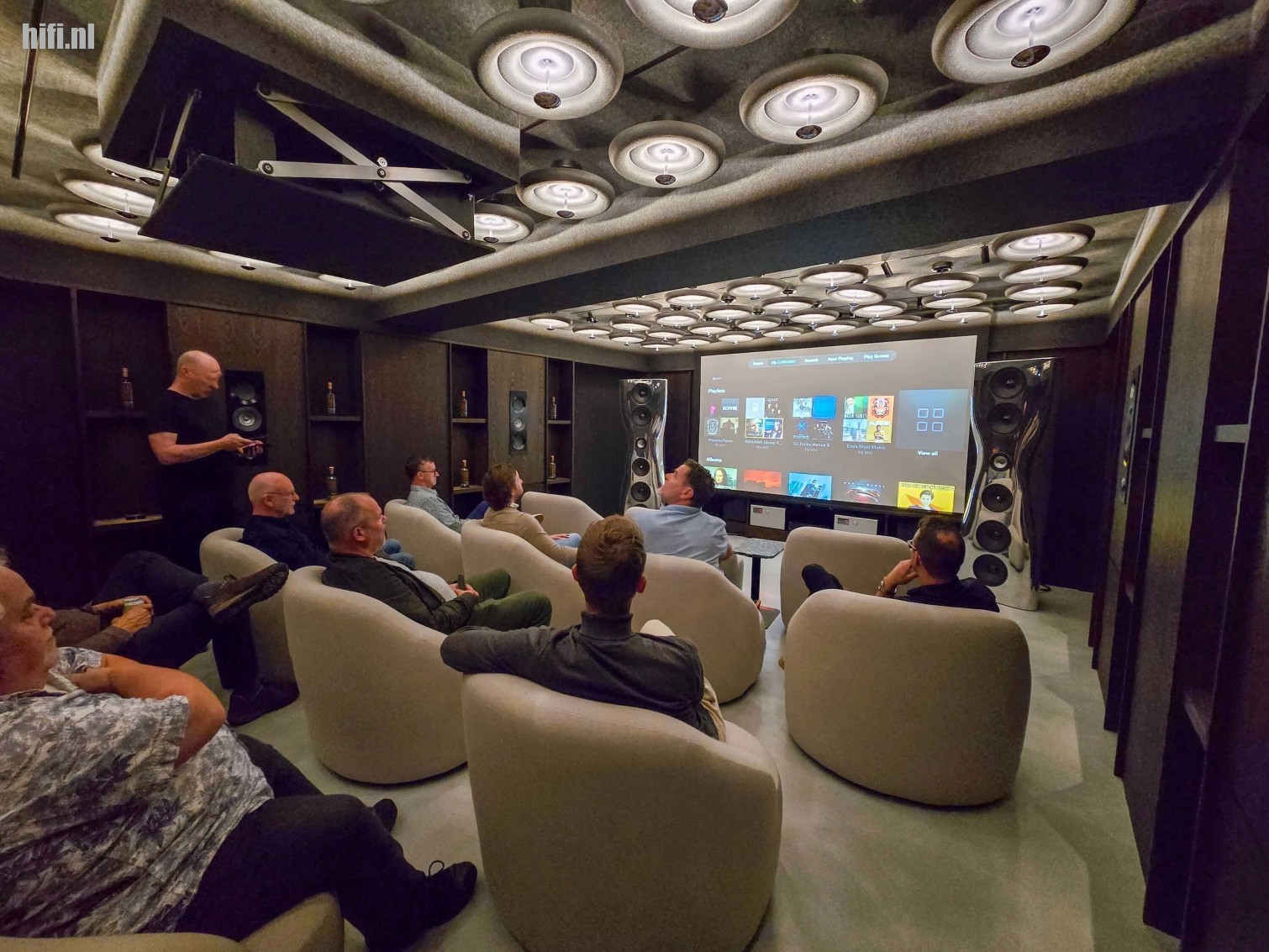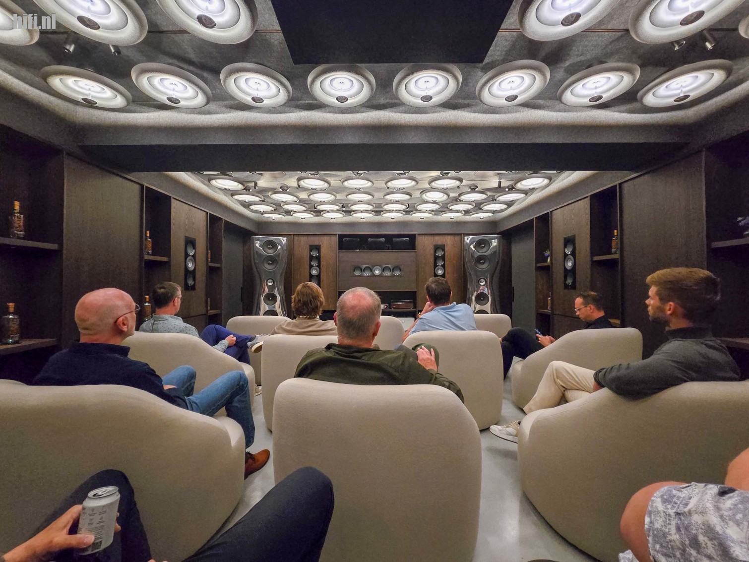 Voor de Atmos-tracks (en het Bowie-event) werd natuurlijk gebruikgemaakt van de surroundopstelling die KEF hier bouwde met z’n Ci5160REFM-THX en Ci3160REFM-THX, de twee ultieme inbouwspeakermodellen die gebouwd zijn rond dezelfde technologie die in de Reference-lijk zit. In deze heel casual aanvoelende thuisbioscoop is er, dankzij onder meer Trinnov-processing, een knappe bijna onzichtbare surroundopstelling voorzien die geslaagd laat horen wat KEF op het hoogste niveau kan bieden. Ook hier is enorm veel aandacht besteed aan akoestische ingrepen – kan niet anders, natuurlijk – onder meer met talloze cirkelvormige diffusers die dubbele als indirecte verlichting. Ze deden wat denken aan de conus van een speaker, vast geen toeval.